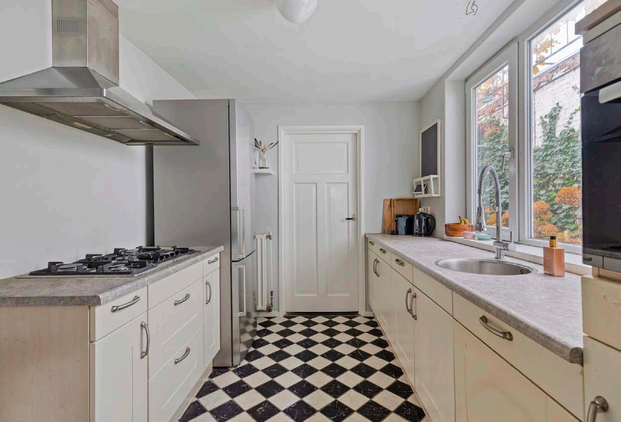Je betreedt de woning via de hal met een klassieke tegelvloer. Terwijl je de gang doorloopt, merk je meteen de doordachte indeling – een perfecte balans tussen sfeer en functionaliteit. Aan de voorzijde van de woning ligt de lichte woonkamer met een prachtige houten vloer die warmte en karakter uitstraalt. Dankzij de openslaande deuren aan de achterzijde sta je zo in de zonnige tuin – dé plek voor gezellige zomeravonden met vrienden of rustige ochtenden met een kop koffie.