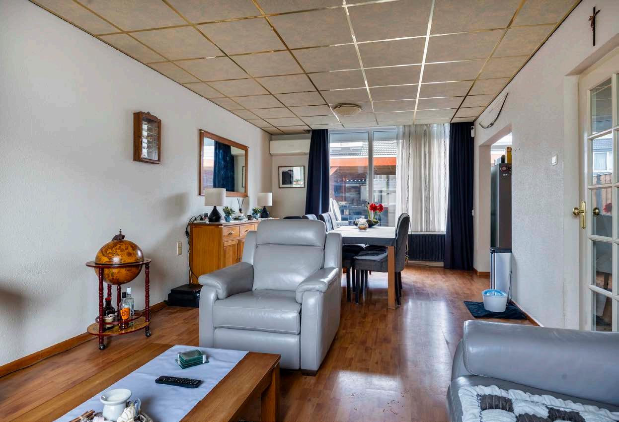 De doorzwoonkamer, met airco en een laminaatvloer, heeft grote raampartijen aan de voor- en achterzijde en deze zorgen voor prettig lichtinval.