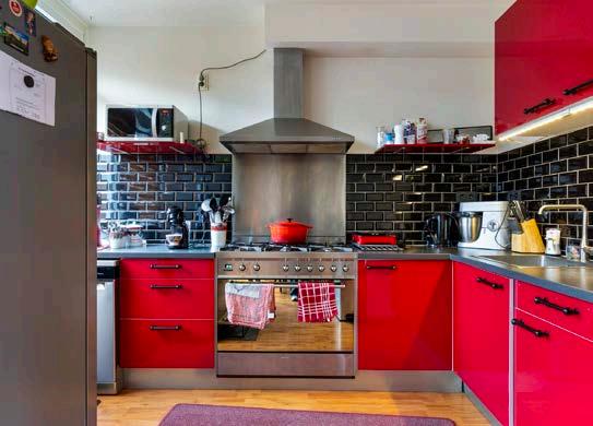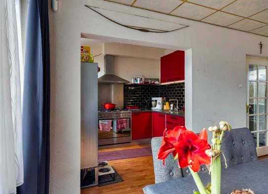 De half open keuken is gelegen aan de achterzijde van de woning en heeft een toegangsdeur door de recent opnieuw aangelegde achtertuin. De keuken is voorzien van een keukeninrichting in hoekopstelling en is voorzien van een RVS gasfornuis en afzuigkap.