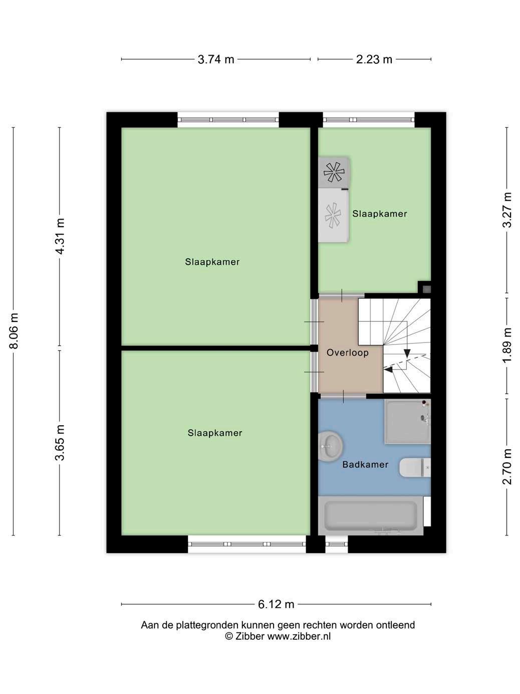 De overloop op de eerste verdieping geeft toegang tot 3 slaapkamers, de badkamer en vaste trap naar de tweede verdieping. De grootste slaapkamer is gelegen aan de achterzijde van de woning en met zijn ca. 16 m² ruim van omvang. De tweede en derde slaapkamer zijn ca. 14 en ca. 7 m².