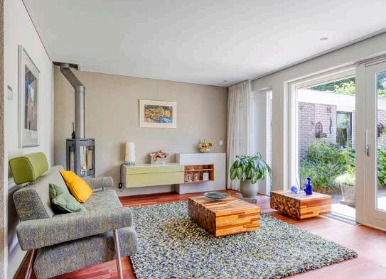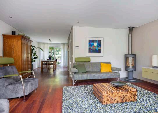 De woonkamer is licht en uitnodigend, met een schuifpui naar de tuin en een knusse houtkachel voor gezellige avonden. De parketvloer voegt extra warmte toe, terwijl de grote raampartijen zorgen voor een overvloed aan daglicht. Hier kun je ontspannen, vrienden ontvangen of genieten van een rustig moment met een boek en een kop koffie.