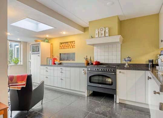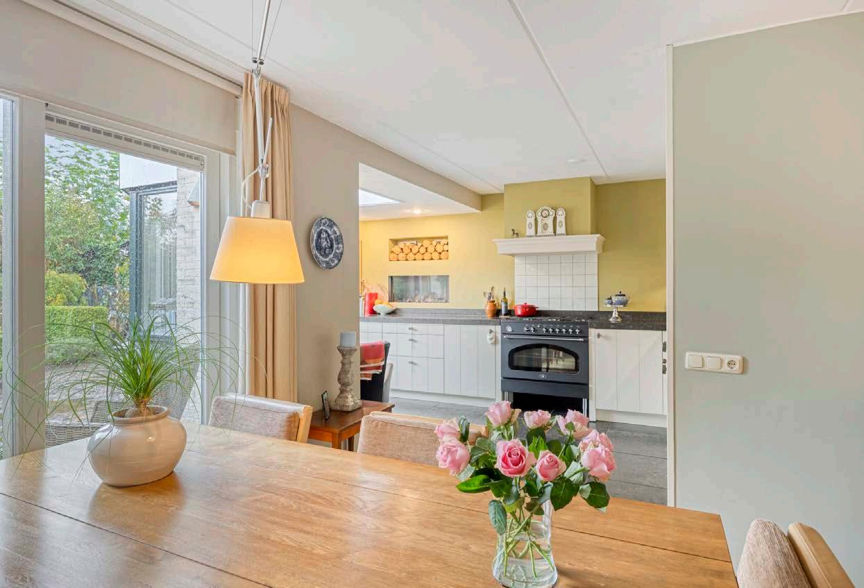 Aan de achterzijde is er een halfopen keuken. Deze keuken is netjes en praktisch ingericht en biedt directe toegang tot de tuin.