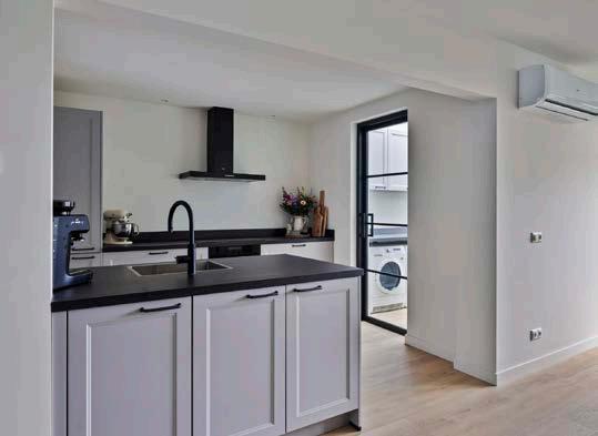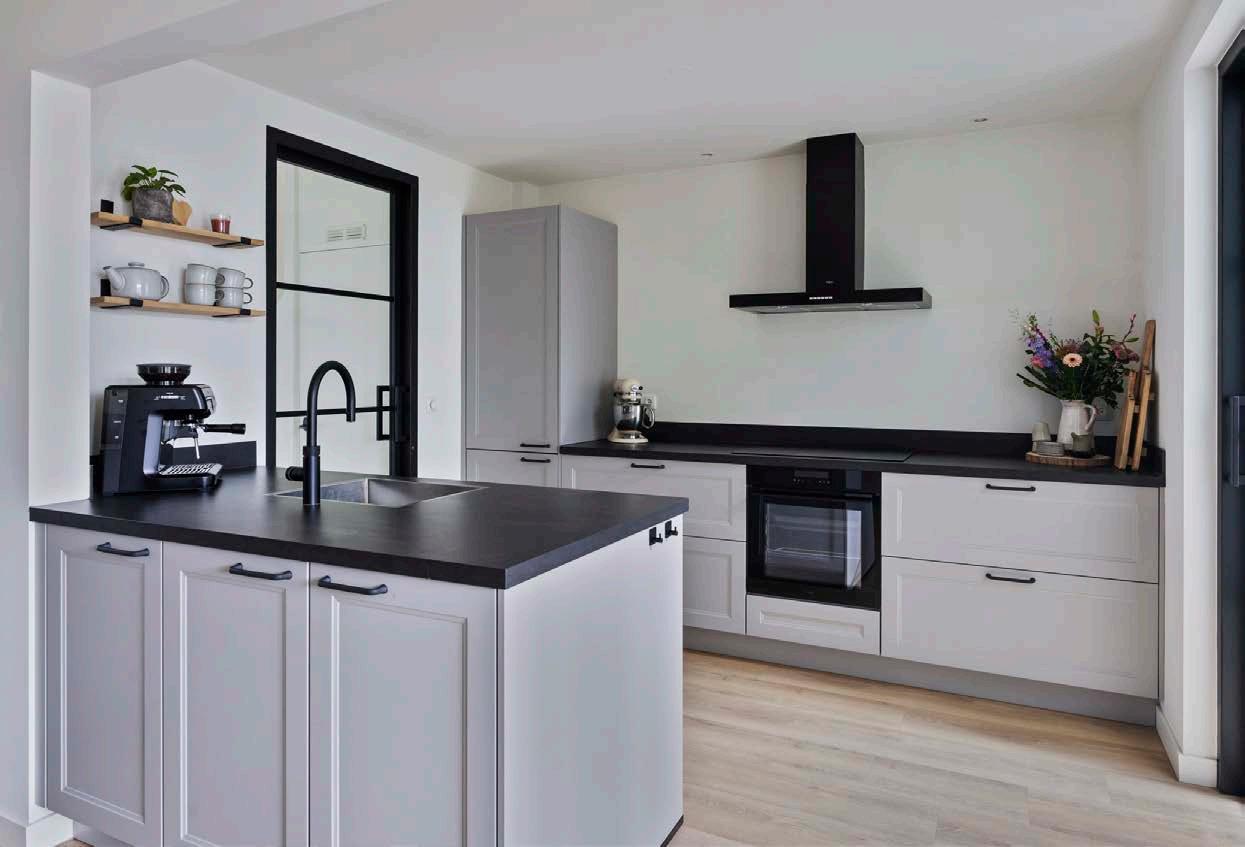 De moderne keuken met spoeleiland is geplaatst in 2024 en biedt alle benodigdheden voor het bereiden van lekkere maaltijden. Aangrenzend aan de keuken is de eetkamer, een fijne plek voor familiediners of gezellige avonden met vrienden. Vanuit de keuken heb je toegang naar de bijkeuken met aansluiting voor het witgoed. Tevens is de begane grond voorzien van vloerverwarming en een airco.