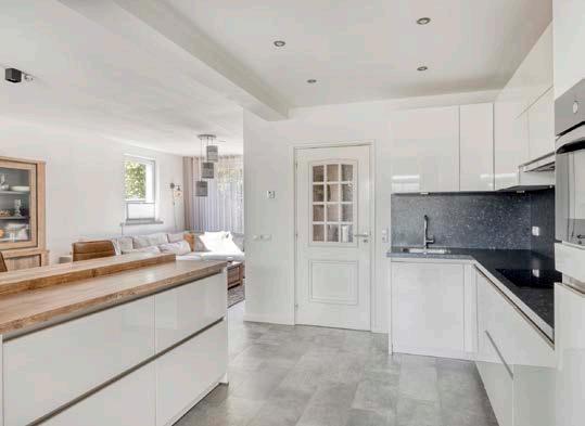 De woonkamer vloeit moeiteloos over in de keuken. Deze is niet alleen praktisch ingedeeld, maar straalt ook stijl en warmte uit. Het koken wordt hier een feestje! Terwijl jij een heerlijke maaltijd bereidt, kijken je kinderen of gasten tevreden toe; er is genoeg plek voor een gezellige eettafel.