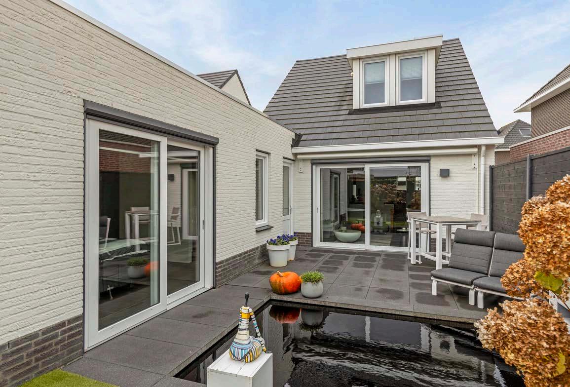 De tuin is een oase van rust en eenvoud. Met een fraaie vijverpartij als centraal element, biedt deze tuin een serene plek om te ontspannen. Dankzij de overkapping kun je het hele jaar door genieten van het buitenleven, ongeacht het weer. Het onderhoudsvriendelijke ontwerp zorgt ervoor dat je meer tijd hebt om te genieten, zonder je zorgen te maken over tuinonderhoud.