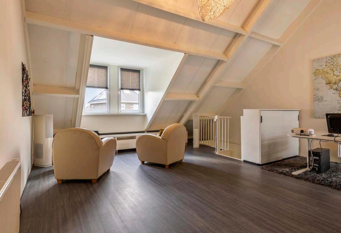 Bij de bovenverdieping hebben we gekozen voor een open indeling, waardoor deze nu afwisselend een studeer/werk/hobbyruimte is of door de muziekinstallatie en beamer omgetoverd kan worden in een muziek- of