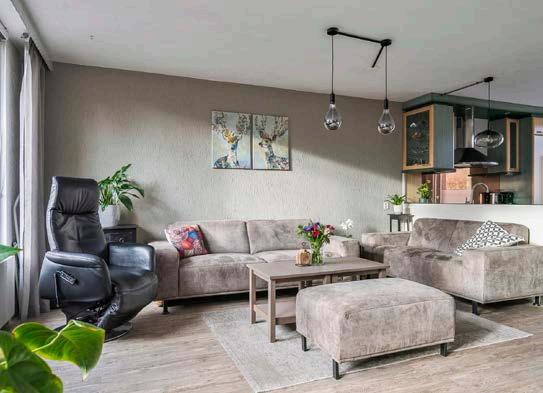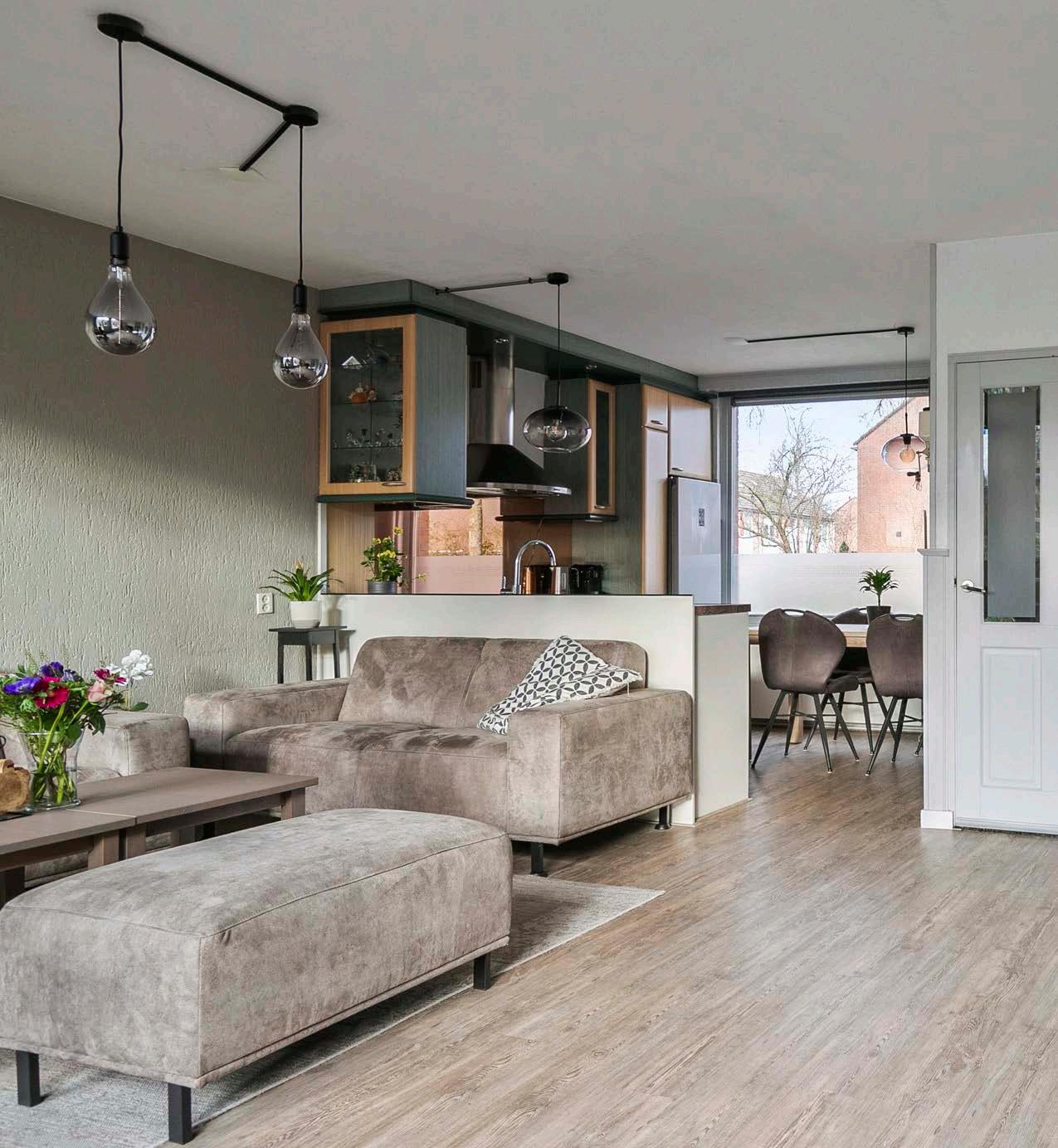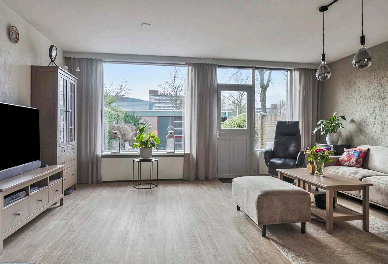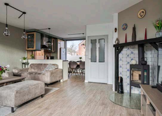 De woonkamer is voorzien van een duurzame pvcvloer die zowel praktisch als stijlvol is. De grote ramen zorgen voor veel natuurlijk licht, waardoor de woonkamer een warme en uitnodigende sfeer heeft.