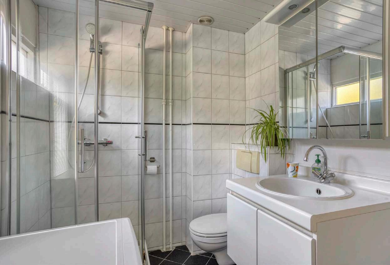 De badkamer is functioneel en biedt alles wat je nodig hebt: een douche, een wastafel en een tweede toilet.