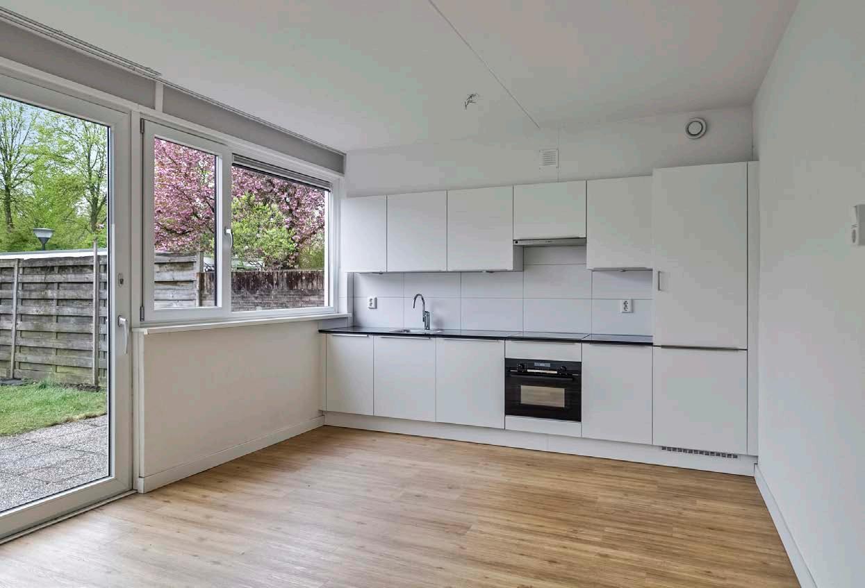 De halfopen nette keuken vangt erg veel licht door de schuifpui naar de tuin. De keuken biedt alle benodigde inbouwapparatuur in de vorm van een koel-/vriescombatie, combioven, vaatwasmachine, inductiekookplaat met afzuigunit, spoelbak en veel opbergruimte. De strakke lijnen en neutrale kleuren zorgen voor een tijdloze uitstraling die je gemakkelijk kunt aanpassen aan je eigen smaak met een persoonlijke touch. Of je nu een uitgebreide maaltijd wilt bereiden of snel iets in elkaar wilt flansen, deze keuken biedt je alle mogelijkheden en gemak.
