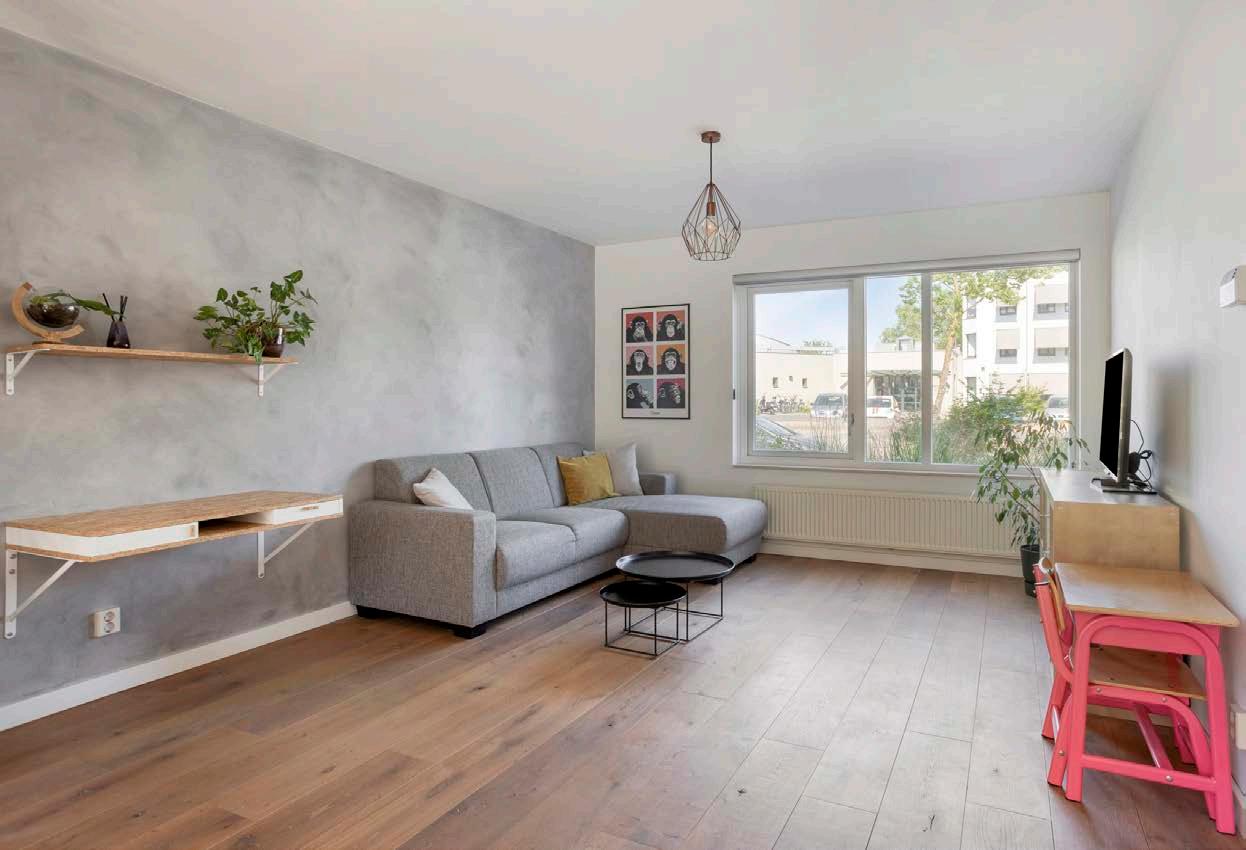 In de lichte en ruimtelijke living voel je je meteen thuis. De houten vloer en frisse wandafwerking zorgen voor een warme, uitnodigende sfeer. Dankzij de grote raampartijen aan de voor- en achterzijde stroomt het daglicht rijkelijk binnen en ontstaat er een natuurlijke verbinding tussen binnen en buiten.