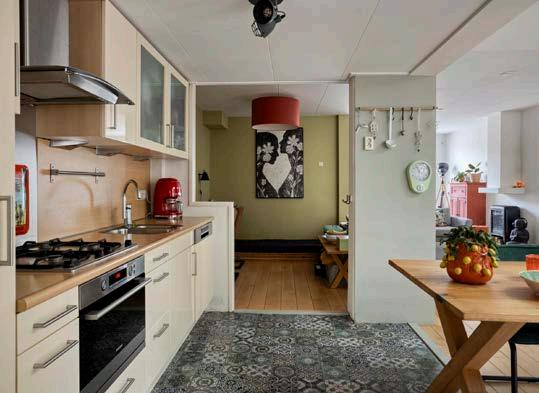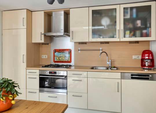 De open keuken bevindt zich aan de achterzijde van de woning. Deze is netjes afgewerkt met voldoende kastruimte en een praktische indeling. Hier bereid je met gemak de lekkerste maaltijden. Extra handig is de bijkeuken die aan de keuken grenst, ideaal voor je voorraad of als plek voor de wasmachine en droger.