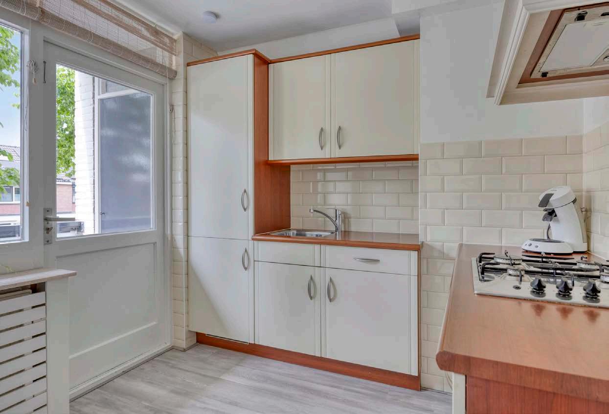 De keuken, geplaatst in een praktische hoekopstelling, is functioneel ingericht. Voorzien van kastruimte boven en onder, en een werkblad dat voldoende plek biedt voor je dagelijkse kookactiviteiten. Hier kun je prima uit de voeten, al biedt de ruimte ook mogelijkheden om met een paar aanpassingen je eigen draai eraan te geven.