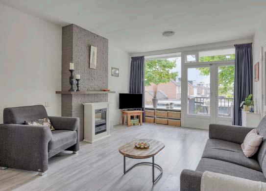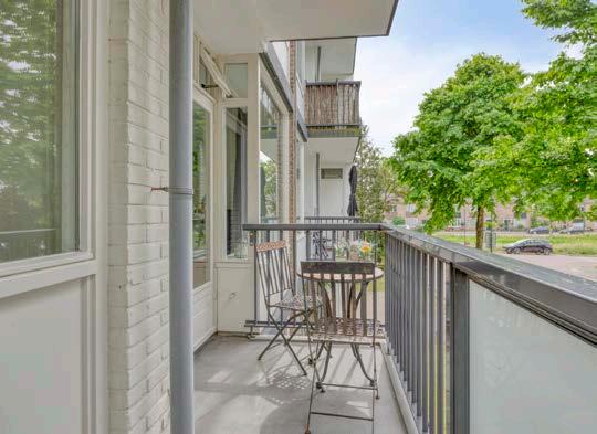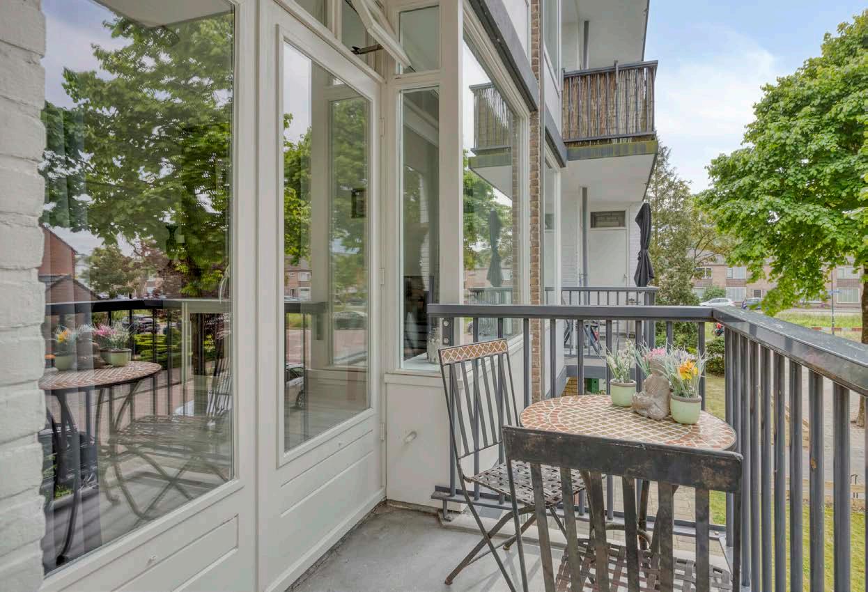 Aan de voorzijde openen dubbele deuren naar het balkon, gelegen op het oosten. In de ochtenduren geniet je hier van de eerste zonnestralen met een kop koffie. De laminaatvloer is neutraal en netjes gelegd, wat de ruimte een frisse uitstraling geeft.