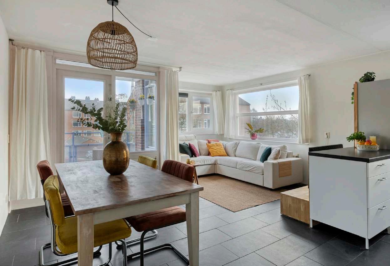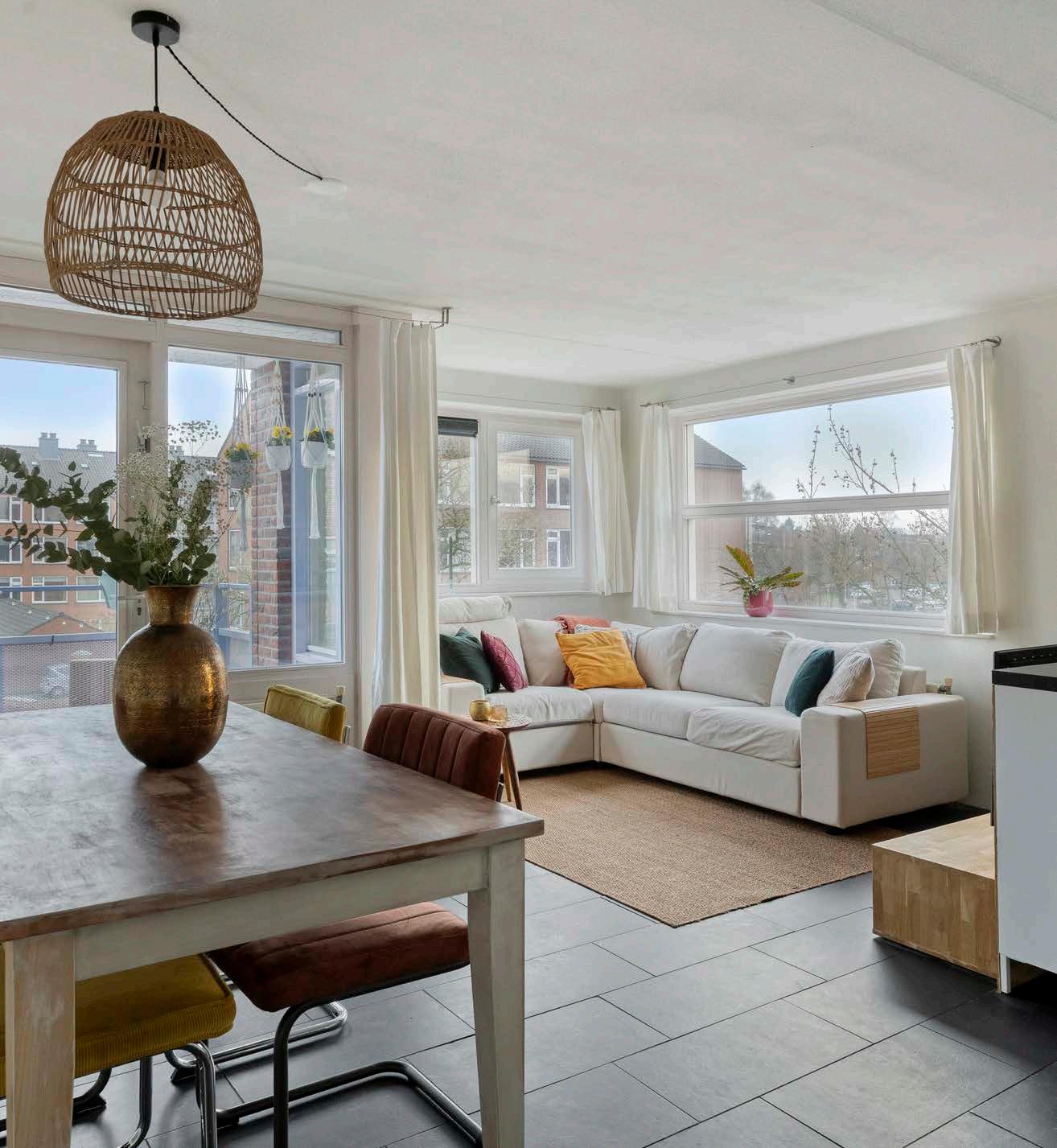De woonkamer is licht en ruim dankzij de grote ramen. Hier geniet je van een fijne zithoek, een gezellige eettafel en volop daglicht. Dit is de plek waar je tot rust komt en gezellige avonden beleeft.