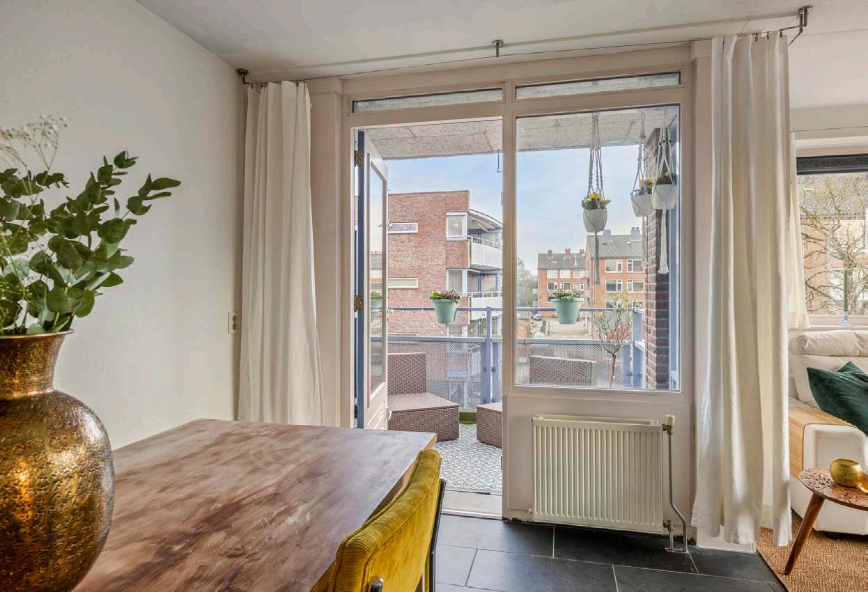Binnen is het stil en licht. Als hoekappartement zonder bovenburen ervaar je veel privacy en rust. Vanaf de bank kun je genieten van het uitzicht: luchtballonnen die voorbijvliegen en reigers die hun nesten bouwen in de boomtoppen van het park; elk seizoen weer een klein moment van verwondering.