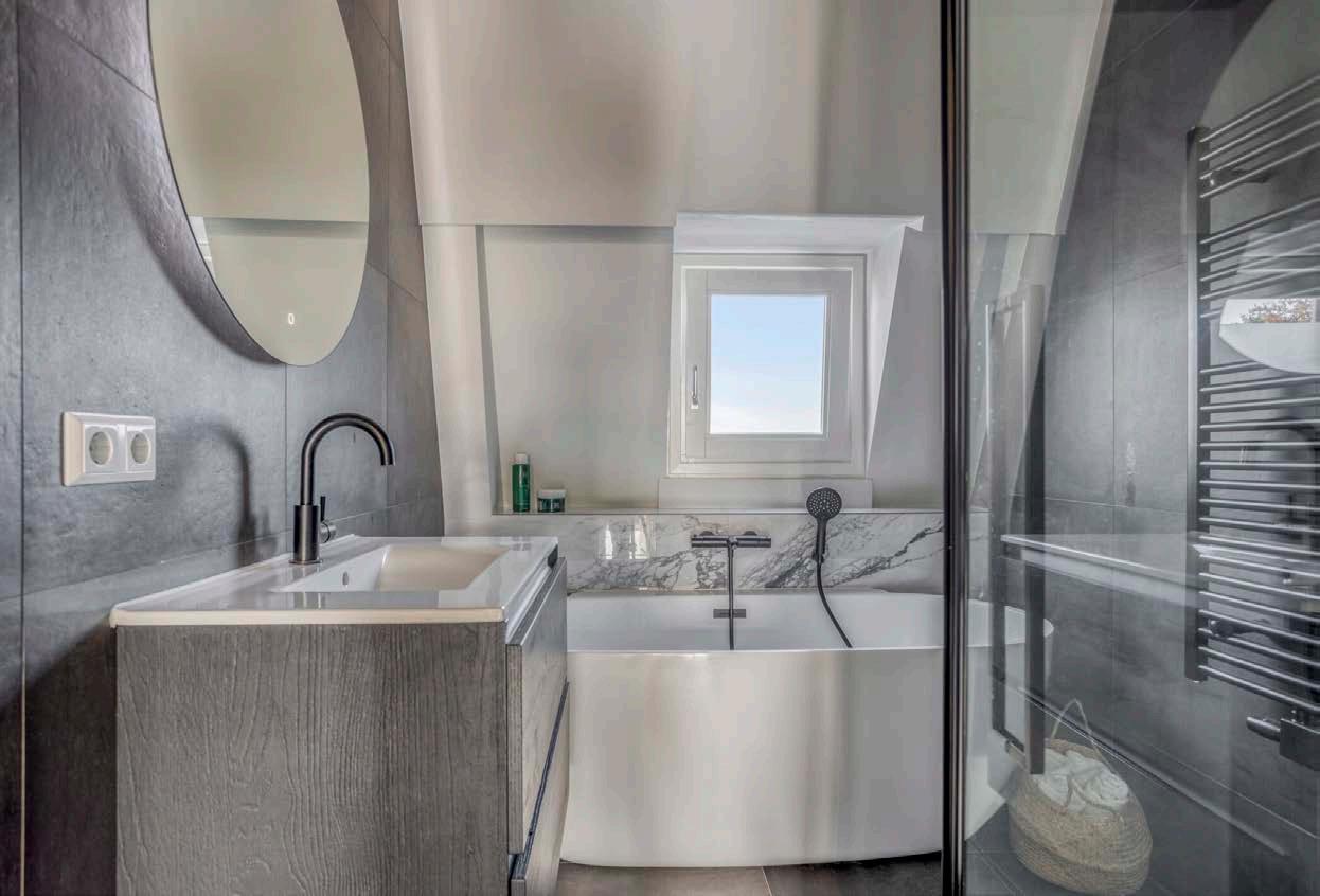 De badkamer straalt rust en elegantie uit dankzij het gebruik van hoogwaardige materialen en een doordachte indeling. Het ligbad vormt een echte eyecatcher: ideaal om na een lange dag volledig te ontspannen. De strakke afwerking zorgt voor een frisse en eigentijdse uitstraling.