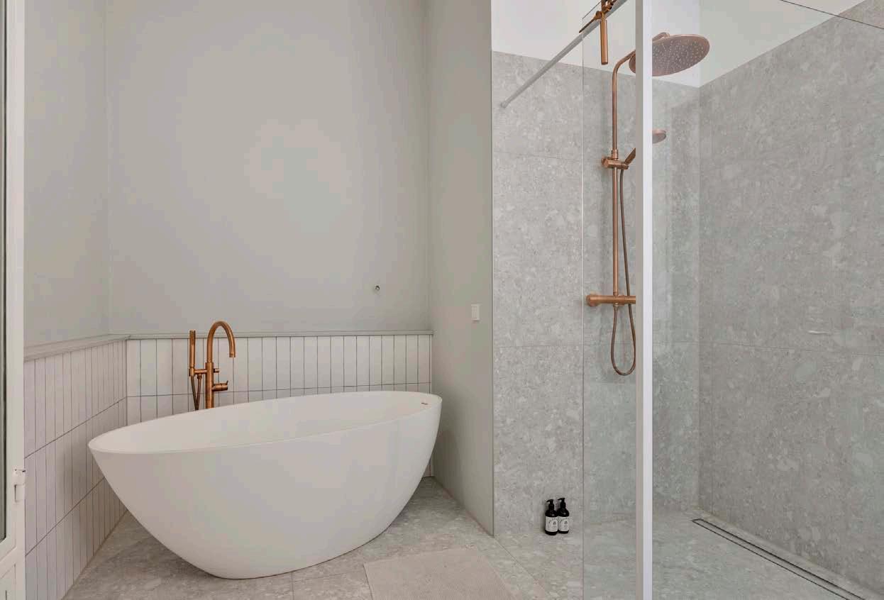 De badkamer (2021) met vloerverwarming, een heerlijke plek om na een dag werken even lekker te ontspannen. De ruimte is van grond tot plafond betegeld/gestuct en heeft een luxe uitstraling. Verder is het geheel ingericht met een inloopdouche, een vrijstaand ligbad, dubbele wastafel en een tweede toilet. Douchen of in bad?
