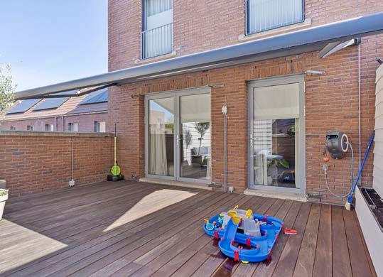 De woonkamer die op de eerste verdieping is gesitueerd, verleent middels de achterdeur toegang tot een royaal dakterras op het zuidwesten. Het terras is volledig bestraat en dus onderhoudsvriendelijk waardoor je hier naar onderhoud dus maar weinig omkijken hebt, ideaal! Het dakterras beschikt over een praktisch elektrisch zonnescherm.