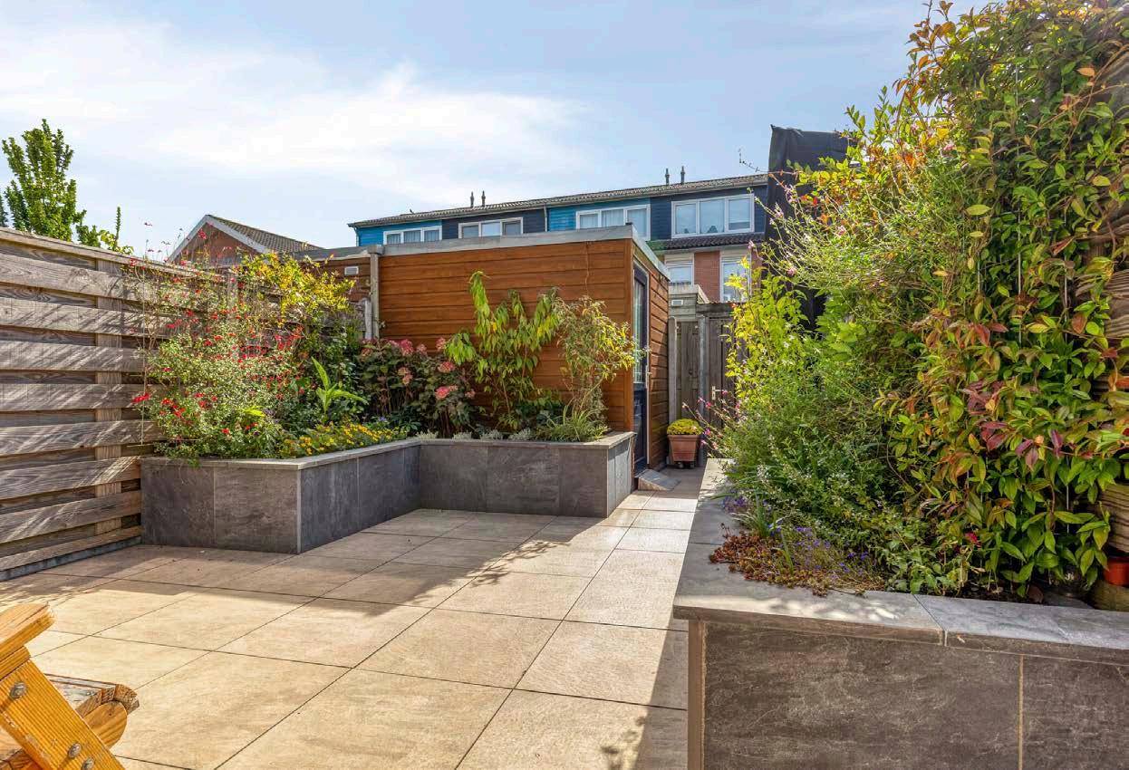 De tuin is gelegen op het zuiden, onderhoudsvriendelijk en biedt volop mogelijkheden om te ontspannen. Of je nu kiest voor een loungeset in de zon of een gezellig diner in de schaduw, er is ruimte genoeg. De berging achterin de tuin is ideaal voor fietsen, tuingereedschap of speelgoed, zodat alles netjes opgeborgen staat.
