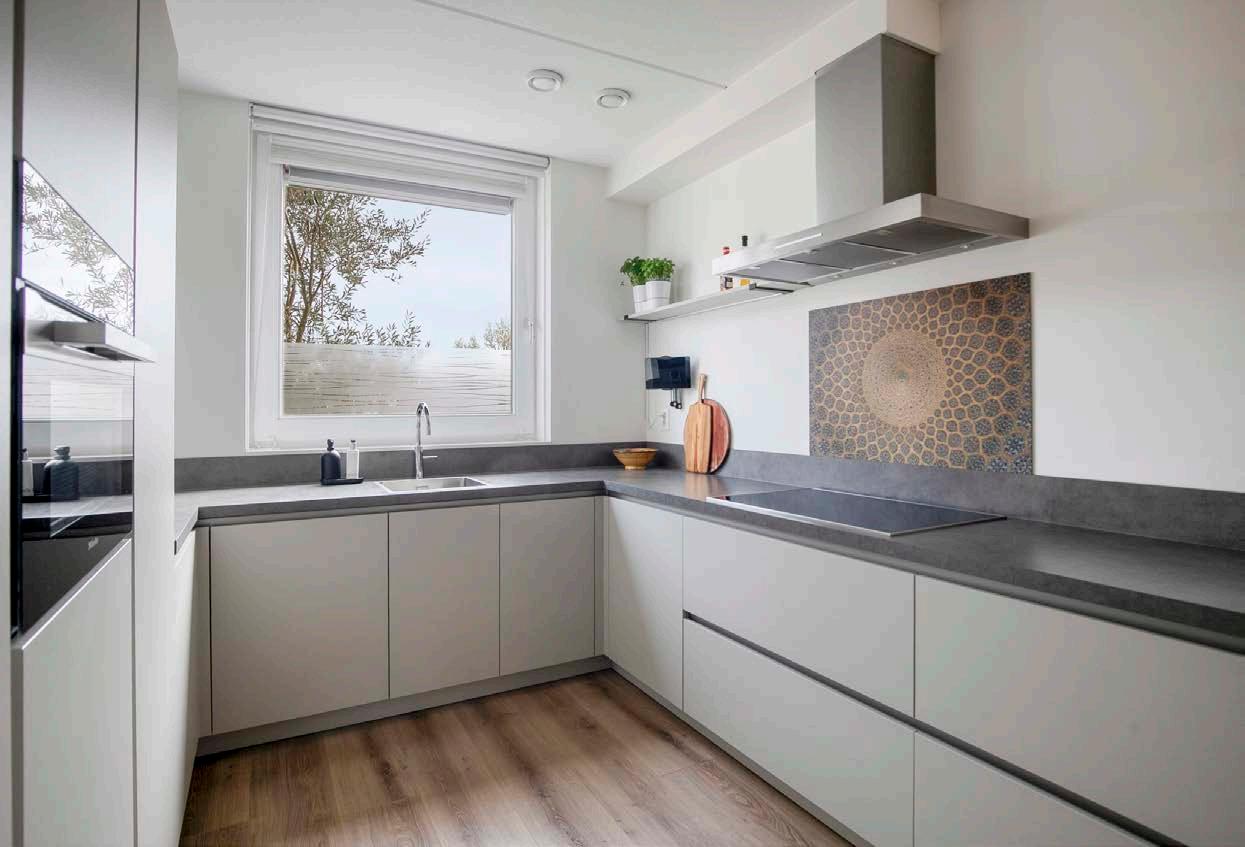 Vanuit de gang loop je naar de woonkamer met open keuken aan de voorzijde. Deze moderne keuken biedt niet alleen een mooie uitstraling, maar is ook slim ingericht met kokend waterkraan en hoogwaardige inbouwapparatuur (o.a. Miele). Hier kook je met gemak de lekkerste maaltijden.