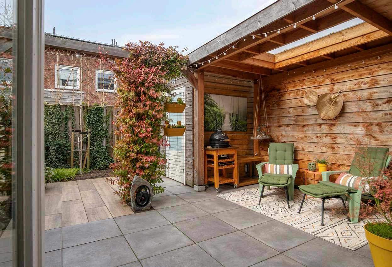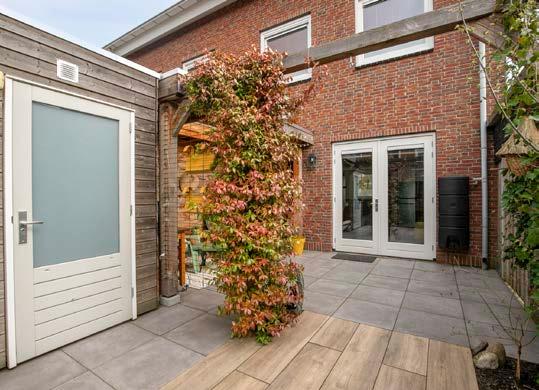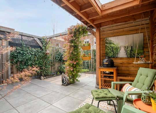 Dankzij de ligging op het zuidwesten en de overkapping kun je hier van ’s ochtends tot laat genieten van het buitenleven, of het nou lentezon is of een warme zomeravond. Ook is de tuin voorzien van een praktische ruime berging en een achterom.