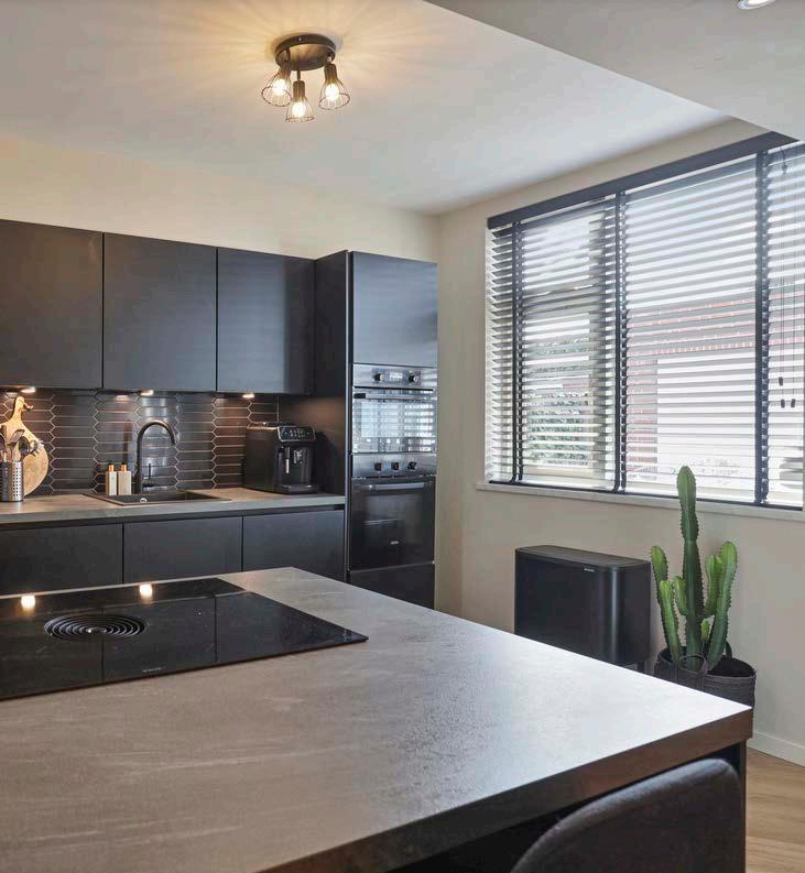 De mat zwarte keuken bestaat uit een wandopstelling en een kookeiland, waardoor je over lekker veel werk- en opbergruimte beschikt. Daarnaast is het geheel rijk uitgerust met diverse inbouwapparatuur, zoals een inductiekookplaat met geïntegreerde afzuiging, combi-oven, oven, vaatwasser, koelkast en een diepvries.