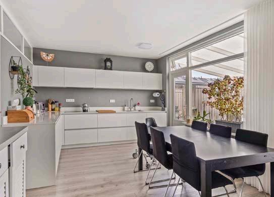 Dit huis straalt eenvoud en rust uit. Zodra je de voordeur opent, stap je in een lichte en verzorgde hal die toegang geeft tot alle belangrijke ruimtes in huis. De woonkamer is een fijne plek met veel daglicht, ideaal om te ontspannen met het gezin of vrienden. De keuken is toegankelijk vanaf de woonkamer en is meer dan compleet. Met een moderne uitstraling, veel opbergruimte en alle nodige inbouwapparatuur kun je hier zonder moeite koken. Praktisch, netjes en zonder poespas – het is een keuken die voor iedereen werkt. Dankzij de raampartijen aan de achterkant kijk je hier direct uit op de tuin.