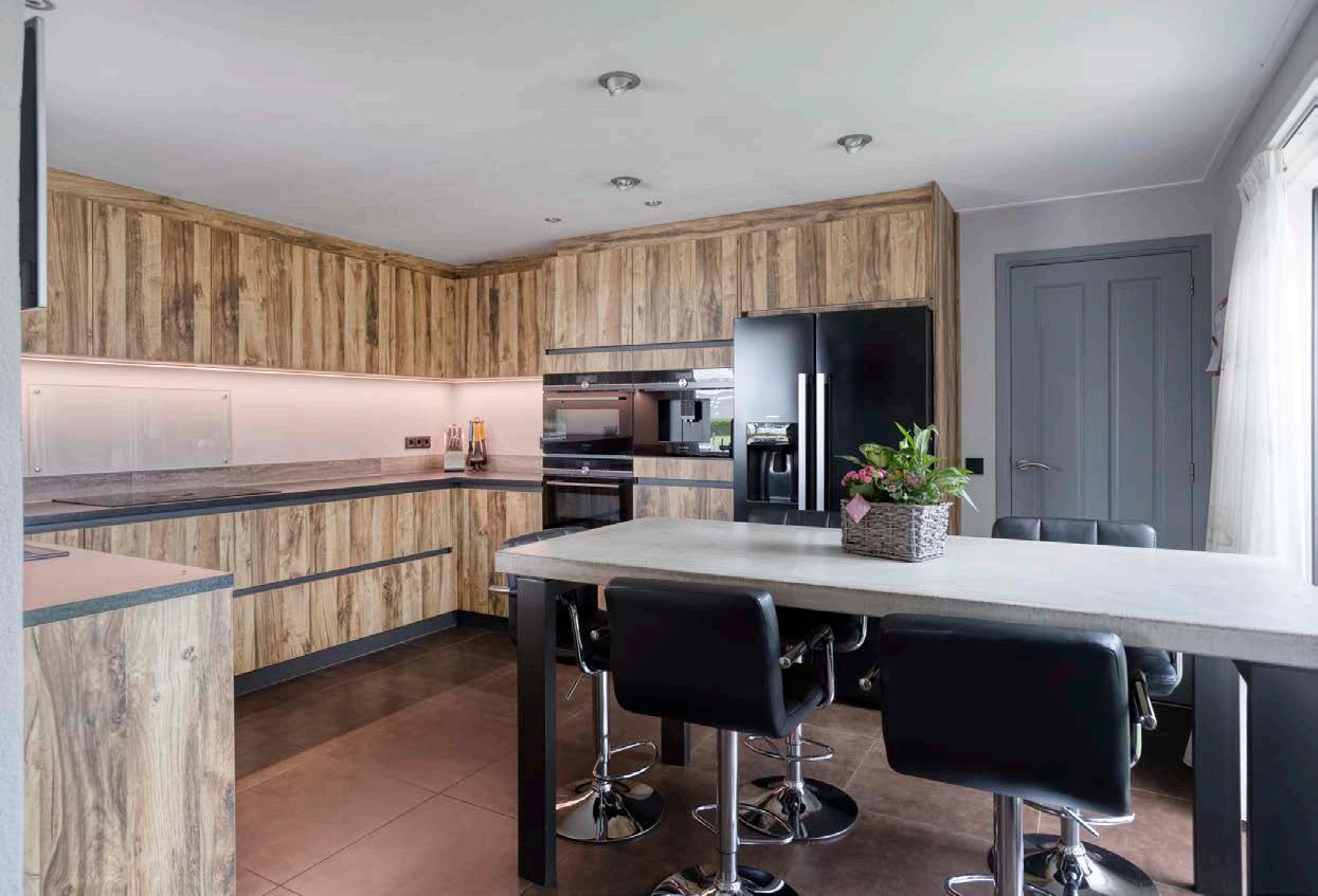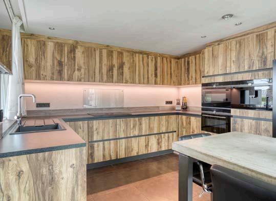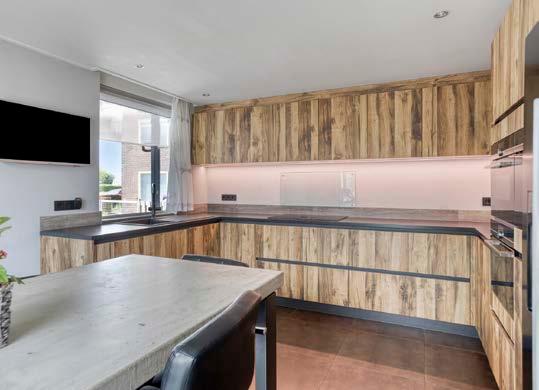 Aansluitend bevindt zich de praktische bijkeuken met extra keukenblok.