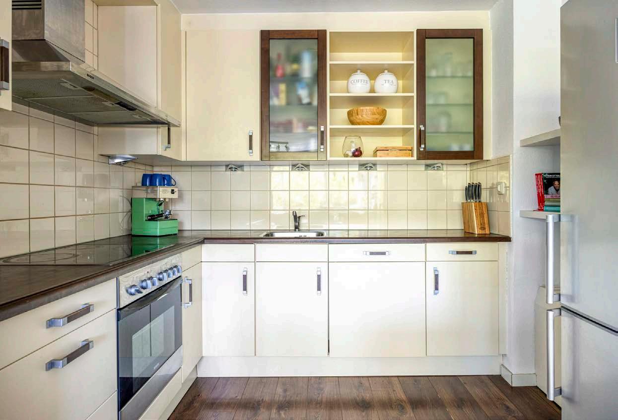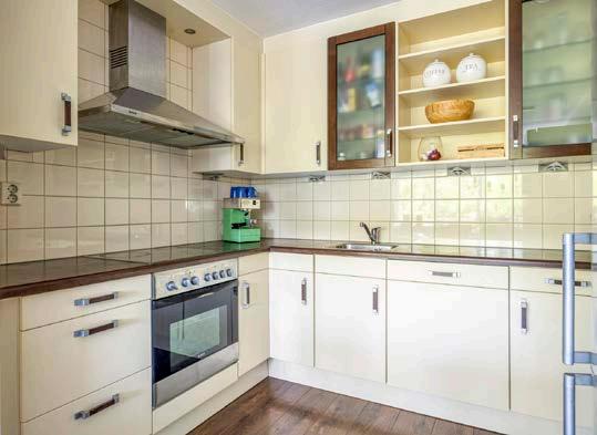 De eenvoudige keuken biedt inbouwapparatuur en dankzij de open indeling blijf je makkelijk in contact met gasten of vrienden. De keuken kun je naar eigen smaak moderniseren. Zie jij die droomkeuken al voor je?