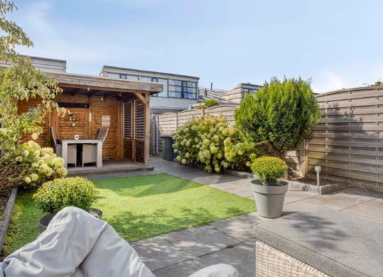 Vanuit de keuken loop je direct de tuin in. Deze is keurig aangelegd en door de zuidwestelijke ligging kun je vanaf het middaguur genieten van de zon. Achterin de tuin vind je een handige overkapping en een berging, ideaal voor fietsen, tuingereedschap of het opbergen van zomerspeelgoed.