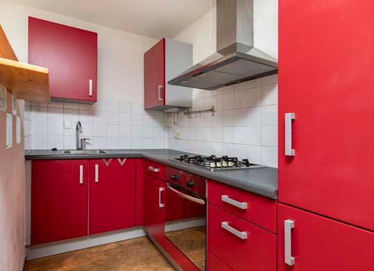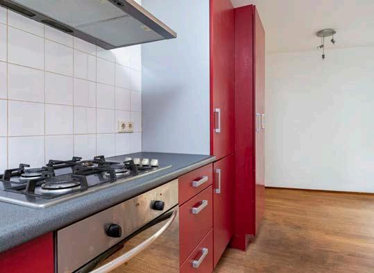 De stijlvolle open keuken in L-opstelling is voorzien van een oven, 4-pitsgasfornuis, rvs afzuigkap en een koel-vriescombinatie.
