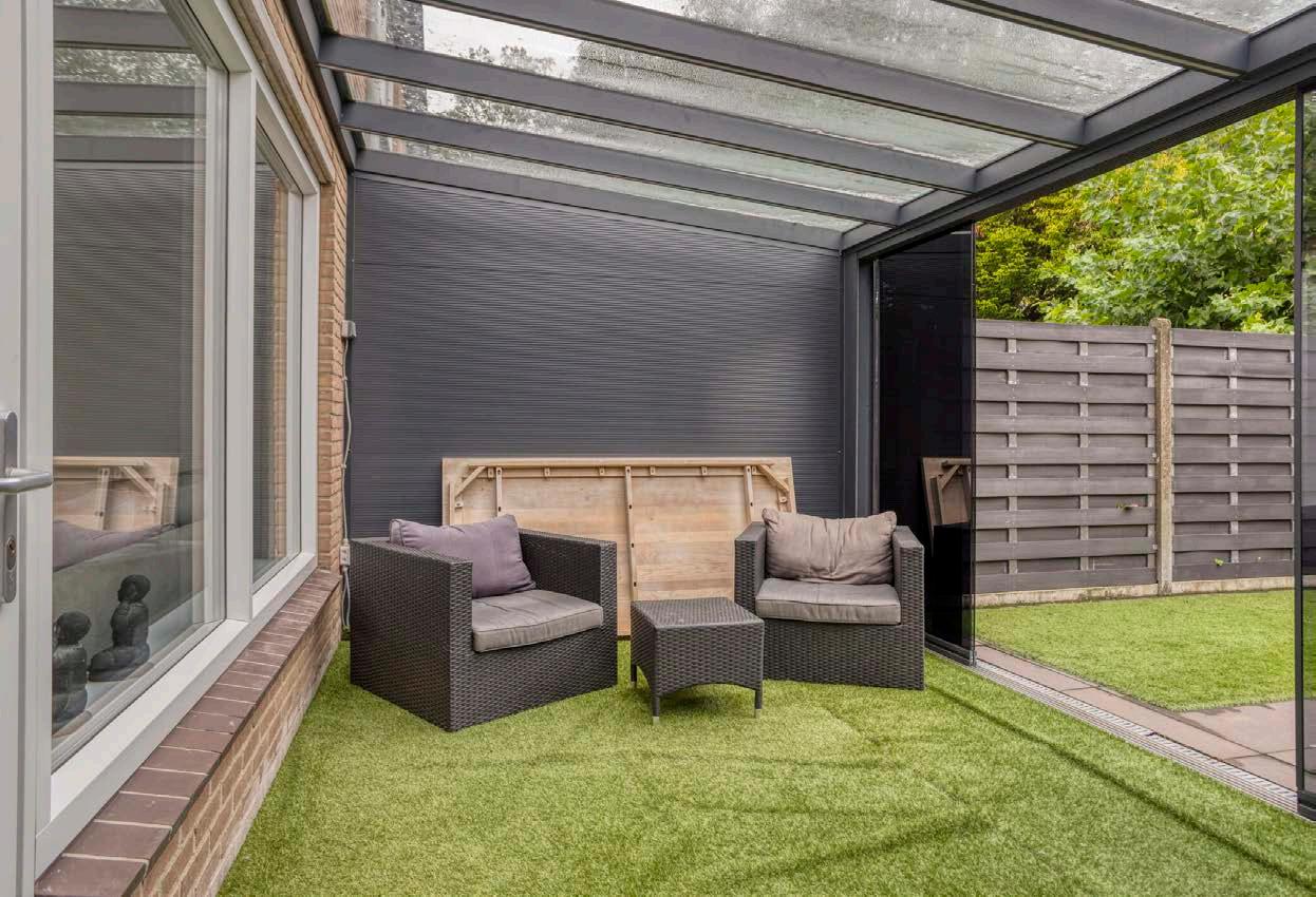 De beglaasde schuifpui brengt je vanuit de woonkamer naar de achtertuin op het oosten. De tuin is bestraat met nieuwe tegels en een overkapping / serre met geïsoleerde damwandpanelen waardoor je hier vrijwel het hele jaar door geniet. Verder is er achter in de tuin nog een overkapping met jacuzzi met stereo-installatie die achter blijft.