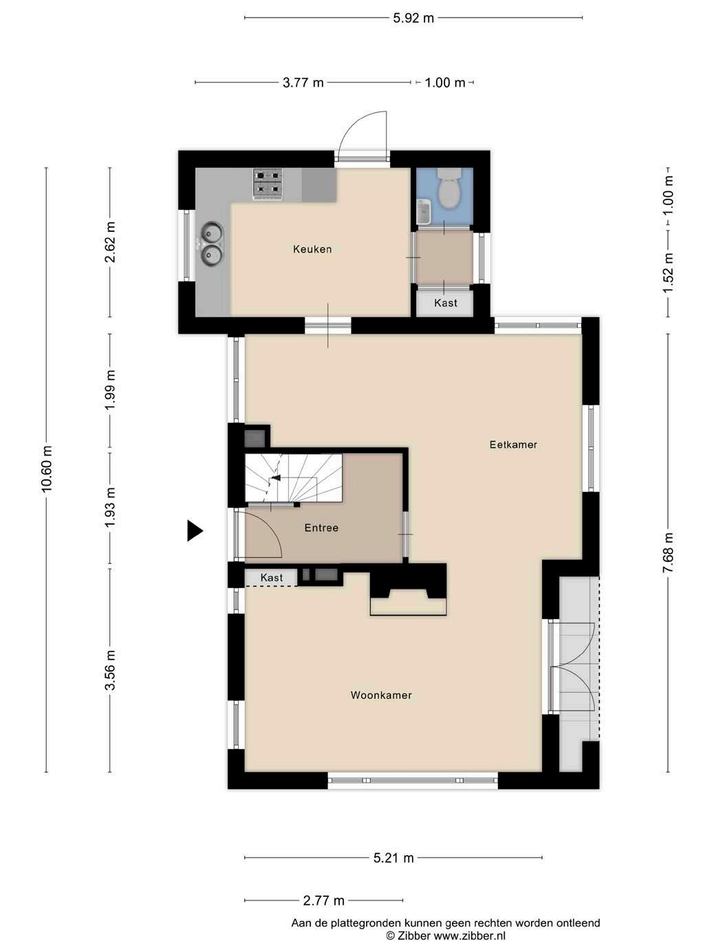 De eetkamer geeft ook toegang tot de dichte keuken aan de achterzijde. Vanuit de keuken kom je bovendien in een kleine hal, waar zich tevens het toilet en een inbouwkast bevinden.