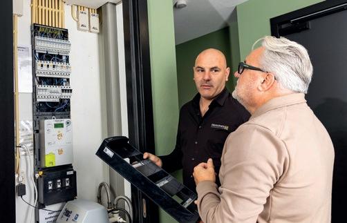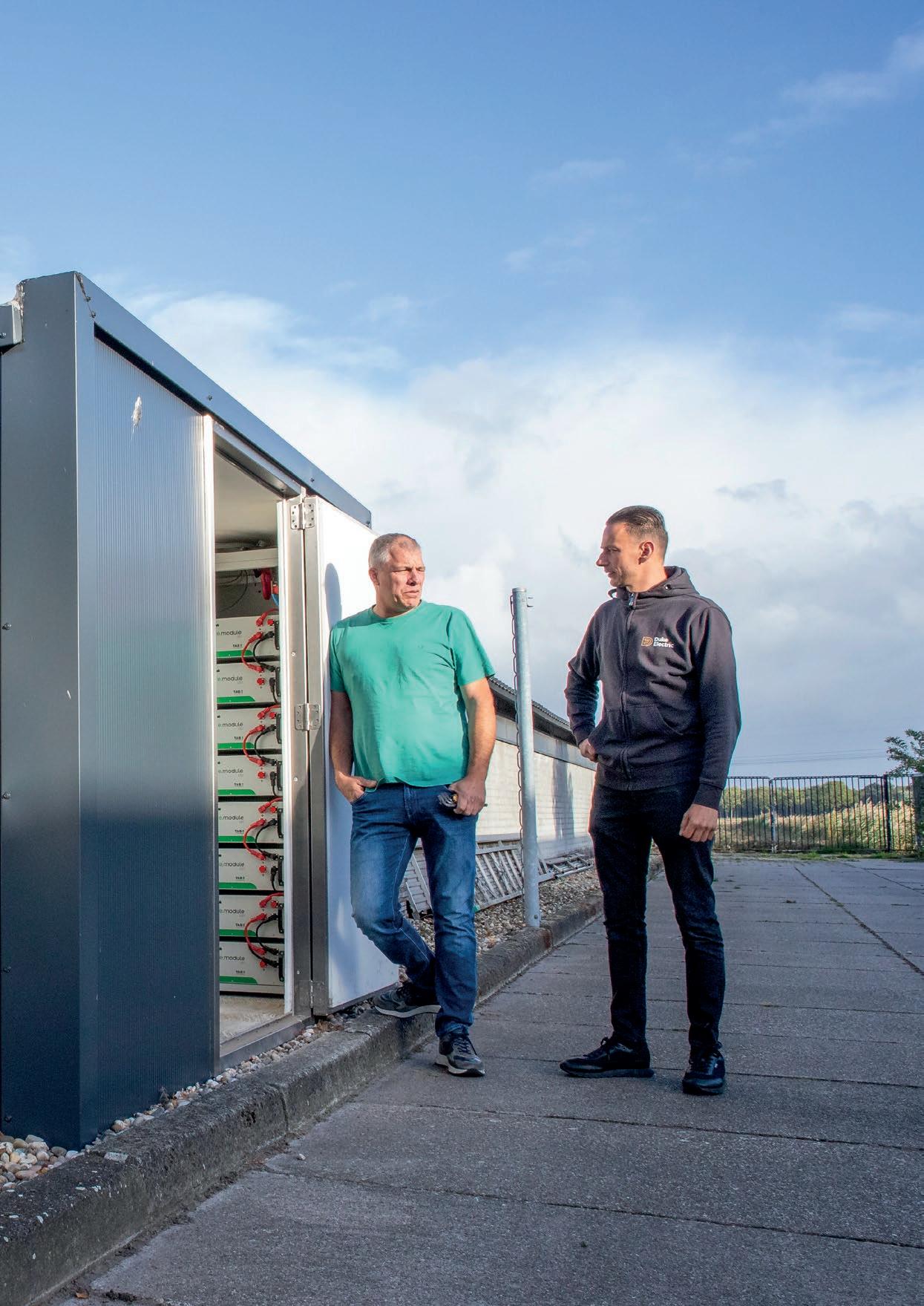 Jonne den Hertog van Duke Electric koppelde bij Loodgietersbedrijf Van Iersel in Elshout 120 zonnepanelen, vier laadpalen, drie Daikin-warmtepompen en een batterijopslag van 80 kWh slim samen. Henk en Fred zijn benieuwd hoe dit lukt op een 3x25 ampère-aansluiting.
