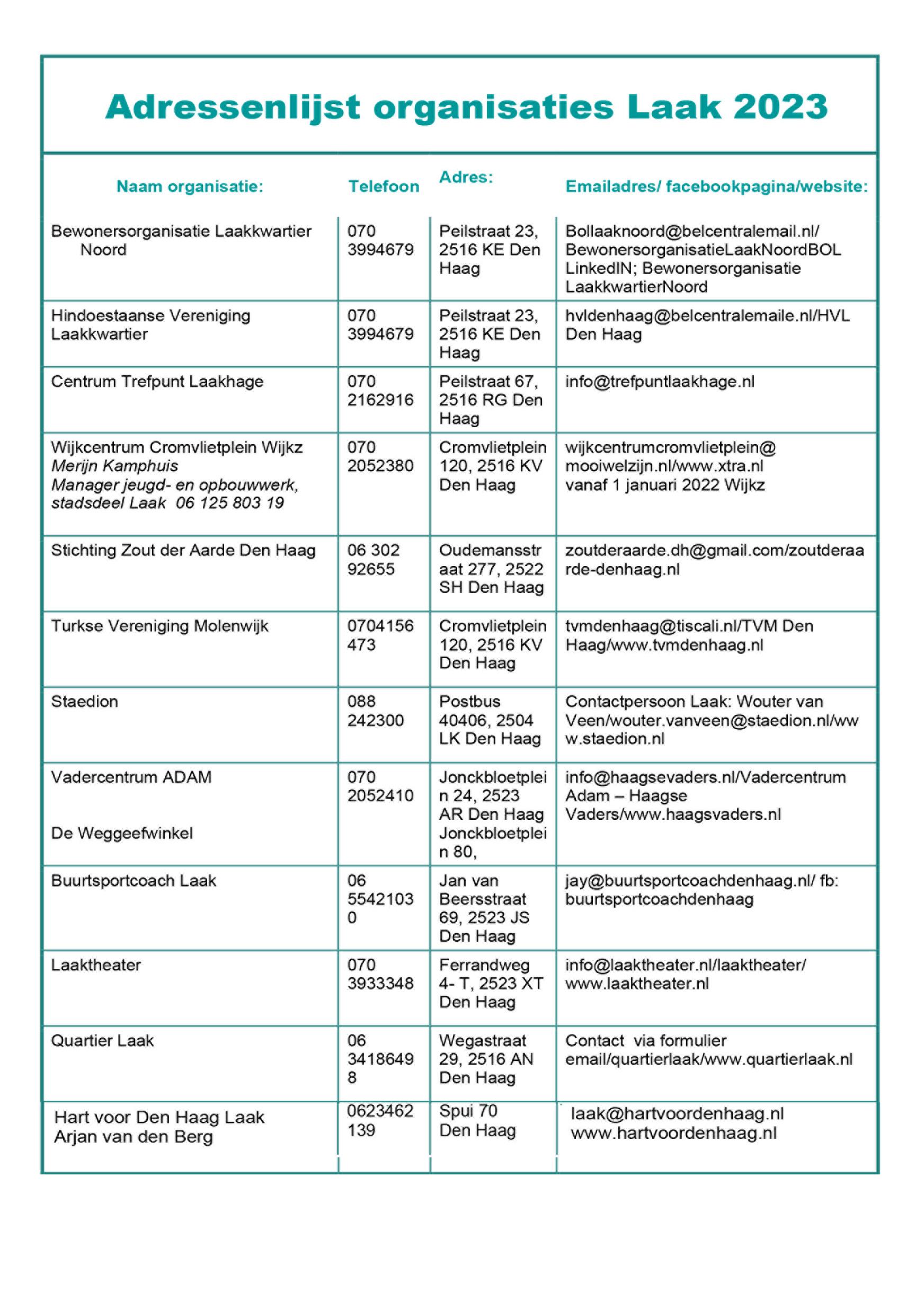 Wilt u een gesprek op een andere dag of locatie? Maak dan een afspraak. Er zijn 5 locaties in Laak. Bel Helpdesk Geldzaken op (070) 353 61 88. Of kijk op: denhaag.nl/helpdeskgeldzaken.