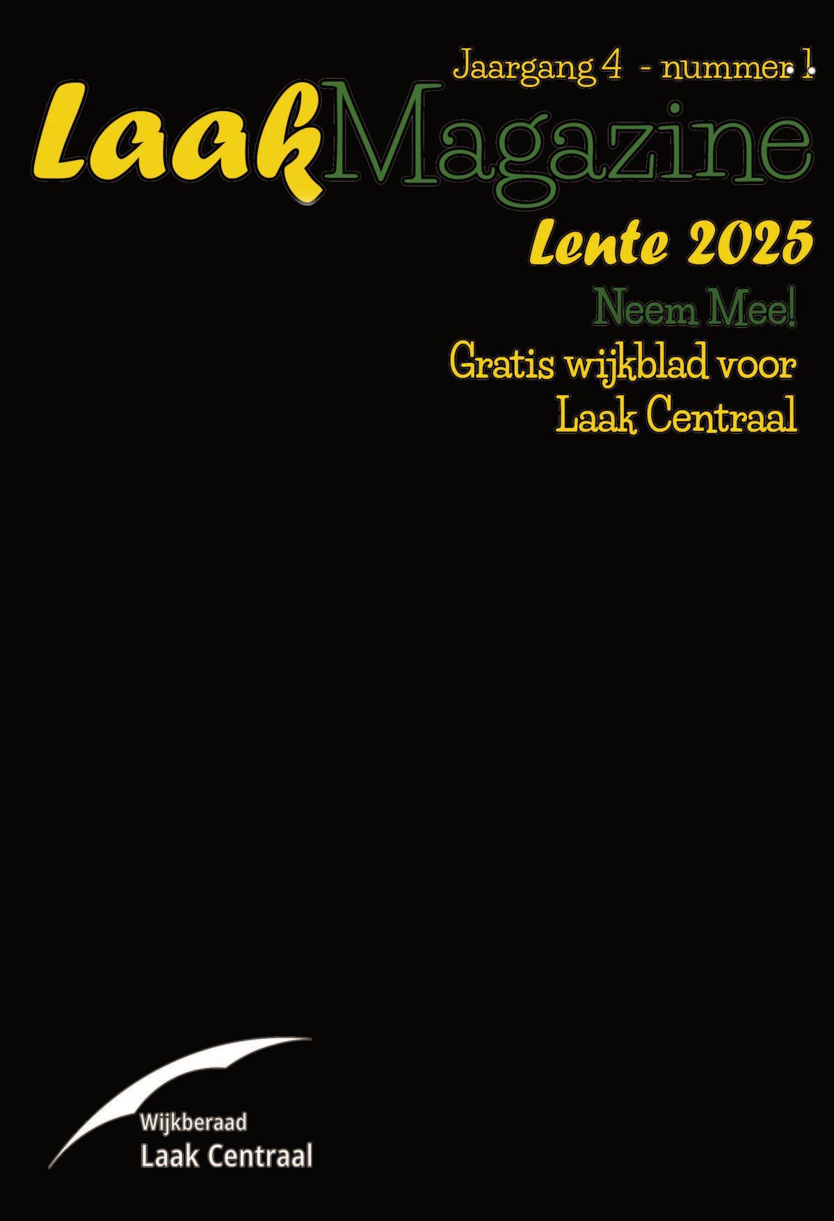 • Het eerstvolgende LaakMagazine komt uit op 1 juni 2025 de UITERSTE deadline voor kopij is 1 mei 2025 Vol is vol! De redactie behoudt zich het recht voor kopij in te korten. Plaatsing is ter beoordeling van de redactie. Kopij dient wijkgericht te zijn en aan te worden geleverd als onopgemaakt tekstbestand. Afbeeldingen dienen rechtenvrij en hoog resolutie JPEG of PNG te zijn. Kant en klare Flyers worden niet geplaatst, tenzij als betaalde advertentie.