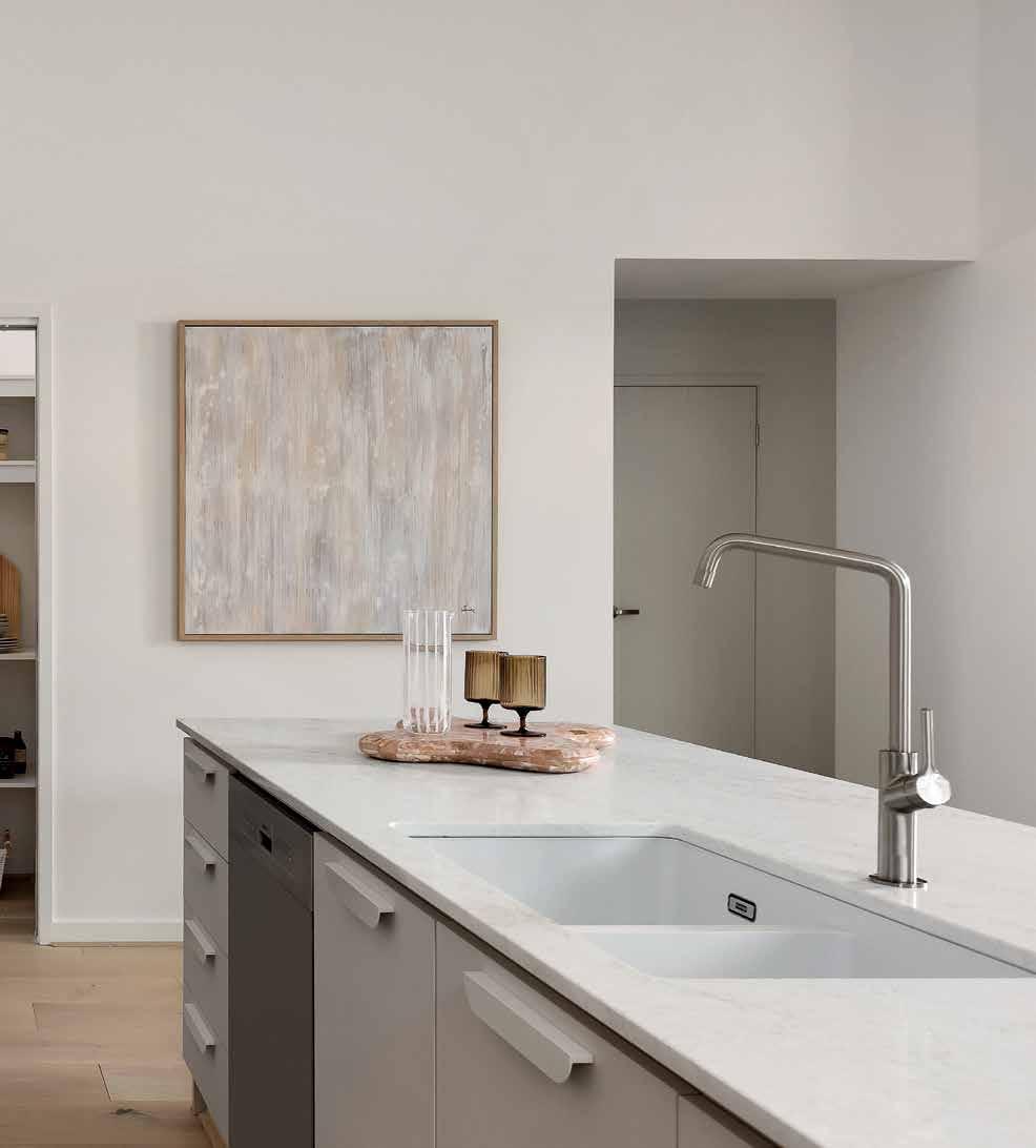Enjoy 20mm edge Zenith Surfaces (Vitrified Compact Surfaces) in your kitchen. Exceptional performance and strength make Zenith Surfaces by Stone Ambassadors the perfect surface to cook, eat, clean, entertain and host every day. Made with up to 89% recycled materials these environmentally friendly surfaces are spill, scratch and highly heat resistant. Zenith Surfaces advanced manufacturing process gives you peace of mind knowing your benchtops are made with 0% crystalline silica and are available in a variety of colours.