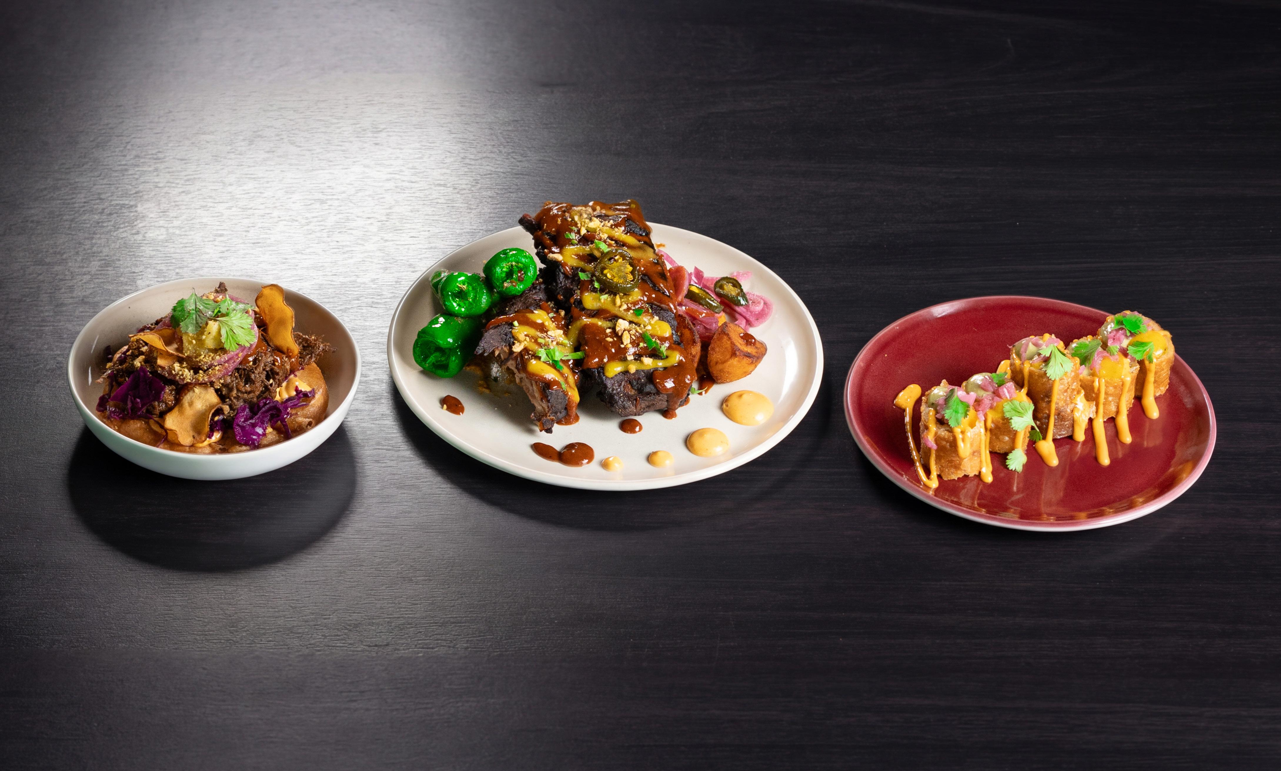 Langtidsbraisert spareribs , mango bbq saus, secret mayo, cowboy candy, crunch og koriander.