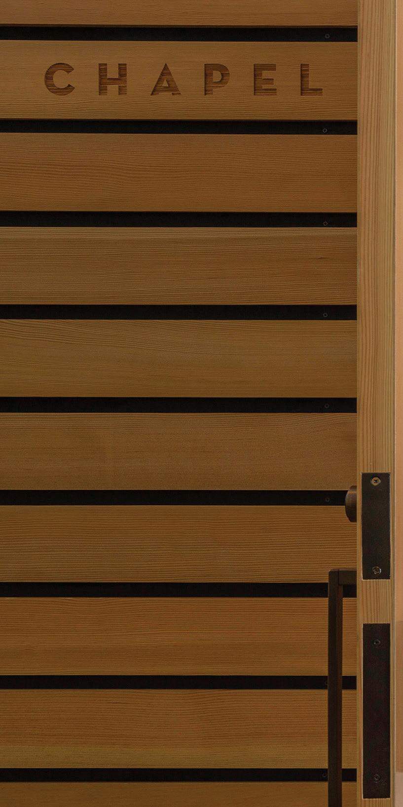 Behind the exterior screen wall, a baptismal font rests in a shallow pool that reflects sunlight into the entry and creates a tranquil passage to the chapel. Here, three large lift-and-slide doors create the opportunity for open-air services.