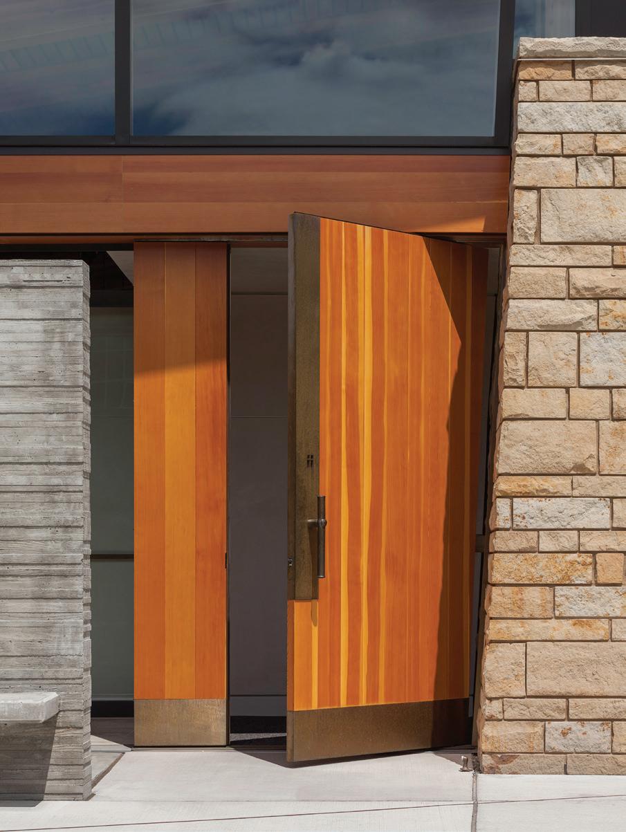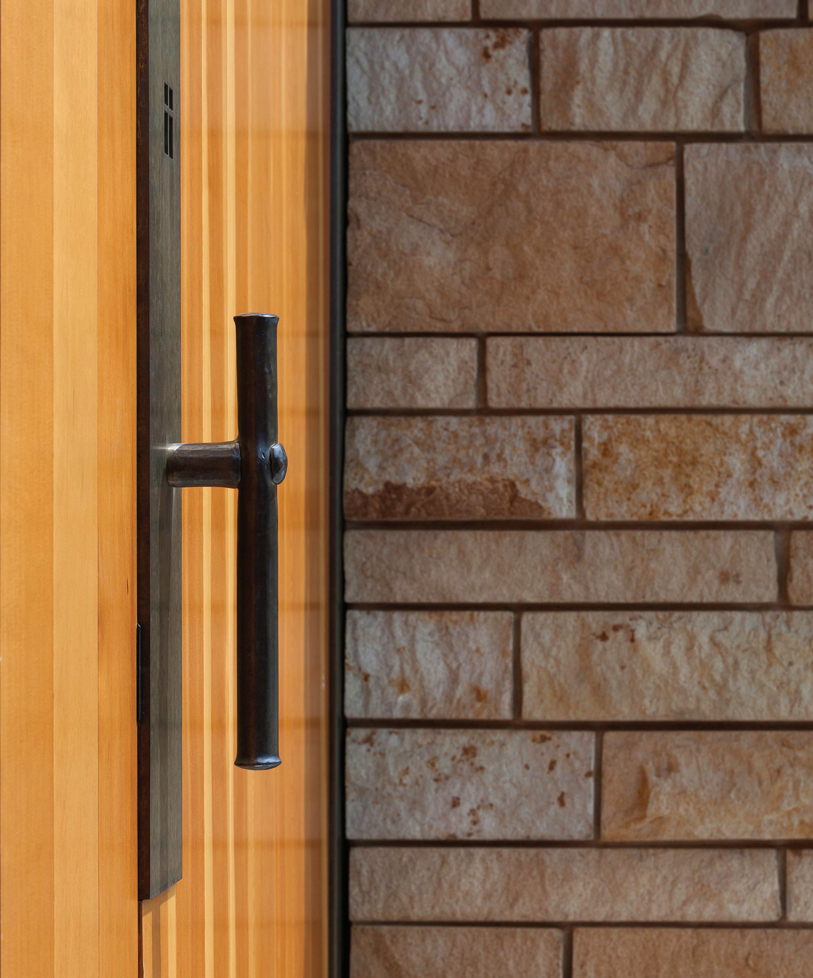 The Jesuit tradition of craft is emphasized throughout the building details. This is most prominent in the custom entry door, pivot-mounted and scribed to meet the battered stone wall. The door is accented with solid bronze inlays and a hand-forged bronze pull.
