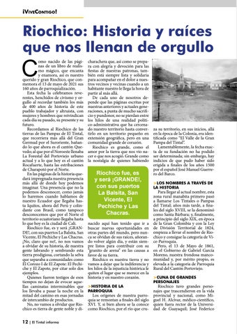 omo nacido de las páginas de un libro de realismo mágico, que encanta y enamora, así es nuestro querido y gran Riochico, que conmemora el 13 de mayo de 2021 sus 160 años de parroquialización. Esta fecha la celebramos reverentes, henchidos de civismo y orgullo al recordar también los más de 400 años de historia de este pueblo trabajador y altruista, con mujeres y hombres que reivindican cada día su pasado, su presente y su futuro. Recordamos al Riochico de las tierras de las Pampas de El Tintal, que recorriera más allá del Gran Germud por el Suroriente, bañando lo que ahora es el cantón Quevedo; al que por el Noroeste llenaba La Forestal del Portoviejo urbano actual y a lo que hoy es el cantón Rocafuerte, hasta las estribaciones de Charapotó por el Norte. En las páginas de la historia quedará impregnada nuestra presencia más allá de donde hoy podemos imaginar. Una presencia que no la podemos desconocer, como jamás lo haremos cuando hablamos de nuestro Ecuador que llegaba hasta Iquitos, ahora del Perú y colindante con Brasil, como tampoco desconocemos que por el Norte el territorio ecuatoriano llegaba hasta lo que hoy es la ciudad de Cali. Riochico fue, es y será ¡GRANDE!, con sus puertos La Balsita, San Vicente, El Pechiche y Las Chacras. ¡No, claro que no!, no nos vamos a olvidar de su historia, de nuestra gente labrando y sembrando esta tierra prodigiosa, cortando la selva que separaba a comunidades como El Corozo I de El Zapote: El Pechiche y El Zapote, por citar solo dos ejemplos. Quienes fueron testigos de esos tiempos no dejan de evocar aquellas caminatas interminables que los llevaba a pasar la noche en la mitad del camino en esas jornadas de intercambio de productos. No, no vamos a olvidar que Riochico es tierra de gente noble y di-