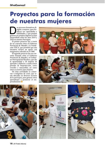 os procesos formativos dirigido a mujeres, para fortalecer sus capacidades y habilidades, y que puedan generar sus propios ingresos se han desarrollado entre los años 2019 y 2020 en nuestra Parroquia. El primer proyecto fue a través de un convenio entre el Gobierno Provincial de Manabí y la Fundación YNCA, que permitió que esta iniciativa tuviera un apoyo con maquinaria valorado en $ 5.000. El segundo proyecto fue un convenio firmado entre el Gobierno Provincial de Manabí y el Gobierno Parroquial de Riochico, que dio la oportunidad a 30 mujeres de aprender a elaborar y confeccionar prendas de bioprotección, como overoles y mascarillas; así como otros accesorios para mujeres. De estas actividades se conservan 4 máquinas de coser, que serán ubicadas en diversos sectores de la parroquia, para generar otros aprendizajes y promover el emprendimiento