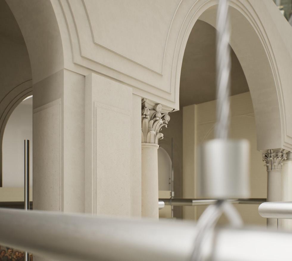 Metal, an industrial material shaped by human hands, and natural stone, rough and irregular, coexist to evoke the rich history of the spa town.