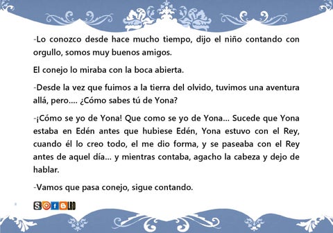 -Lo conozco desde hace mucho tiempo, dijo el niño contando con orgullo, somos muy buenos amigos. El conejo lo miraba con la boca abierta. -Desde la vez que fuimos a la tierra del olvido, tuvimos una aventura allá, pero…. ¿Cómo sabes tú de Yona? -¡Cómo se yo de Yona! Que como se yo de Yona… Sucede que Yona estaba en Edén antes que hubiese Edén, Yona estuvo con el Rey, cuando él lo creo todo, el me dio forma, y se paseaba con el Rey antes de aquel día… y mientras contaba, agacho la cabeza y dejo de hablar. -Vamos que pasa conejo, sigue contando.