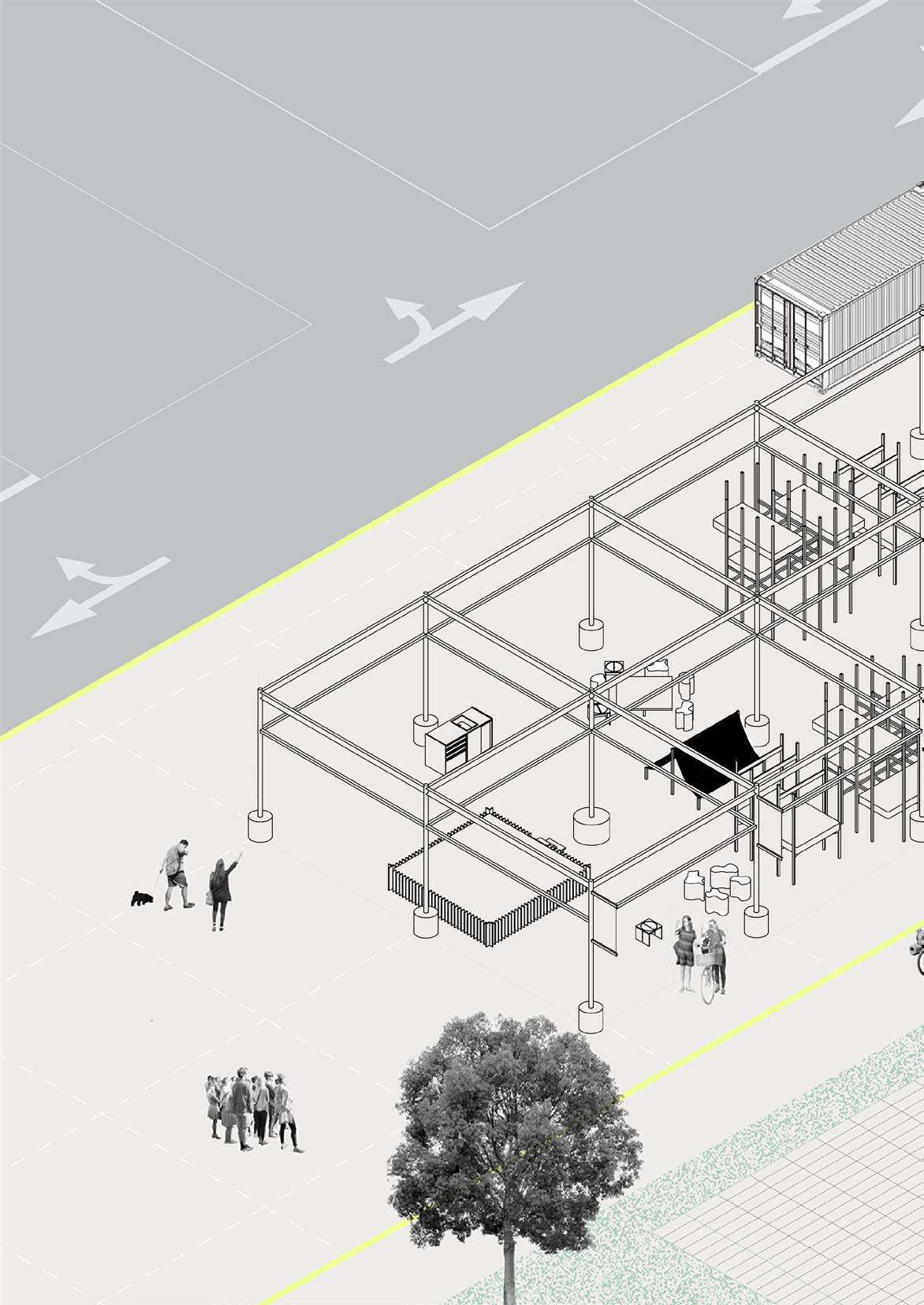 The proposal consists of three main phases: initial marketing, occupation, and publication of findings. Central to the project is an urban campground situated at Queen Victoria Market Testing Grounds. The camp features designed furniture and infrastructure made from building waste, providing movable pieces and shading to offer agency to the homeless. This initiative serves as both a commentary on Victoria’s unsustainable housing model and a means to engage the public in a dialogue about these pressing societal challenges.