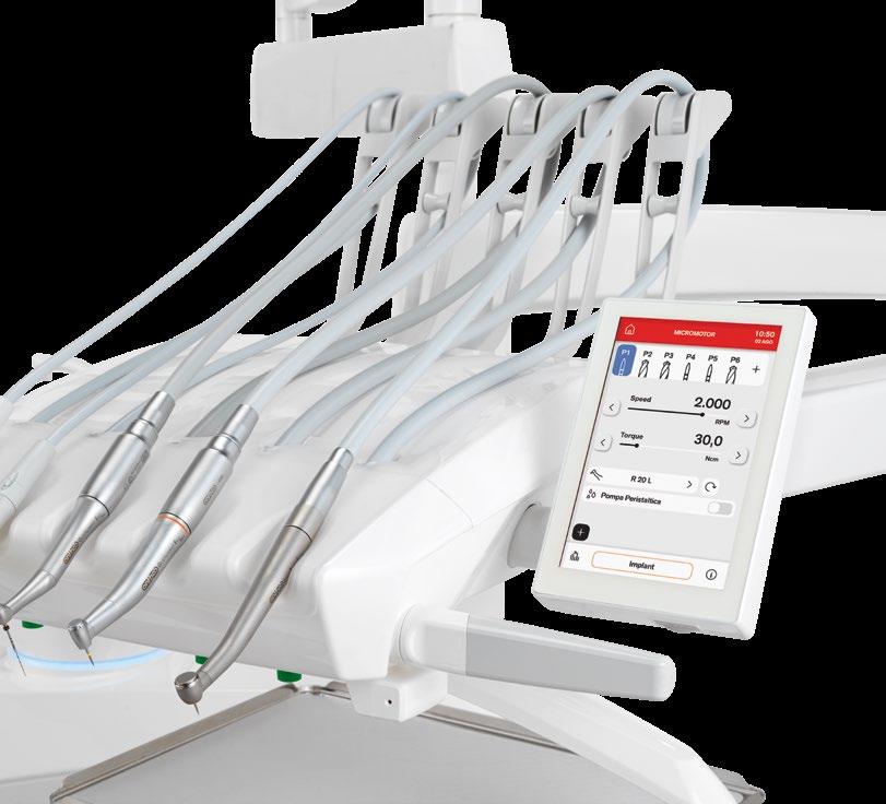 Die perfekte Integration des bürstenlosen Mikromotors, der peristaltischen Pumpe und des dedizierten chirurgischen Handstücks erschaffen ein System für die Implantologie, das über den leistungsstarken Mikroprozessor der 7-ZollMultitouch-Konsole gesteuert wird. Die auf die Drehzahl, das Drehmoment und den Durchsatz der Pumpe bezogenen Parameter können