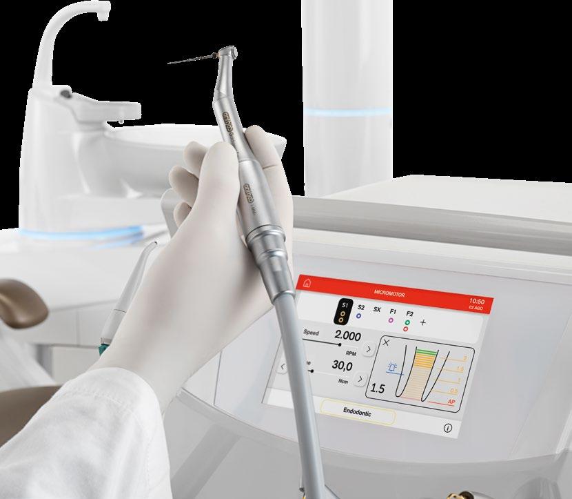Die Fachrichtung Endodontie profitiert von einem kompletten Arbeitssystem, das einen dedizierten, mit Autostop-, Autoreverse- und Autoforward-Funktion ausgestatteten Mikromotor, eine Datenbank für endodontische Feilen und einen optionalen elektronischen Apexlokalisator in sich vereint. Alles wird präzise über eine Full Touch-Konsole