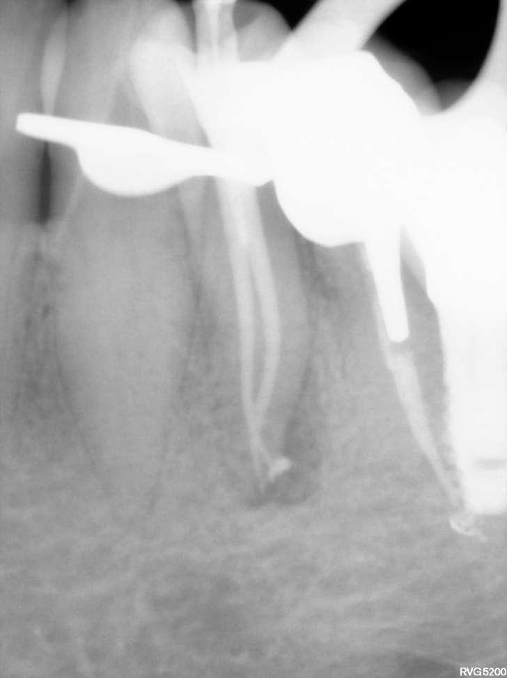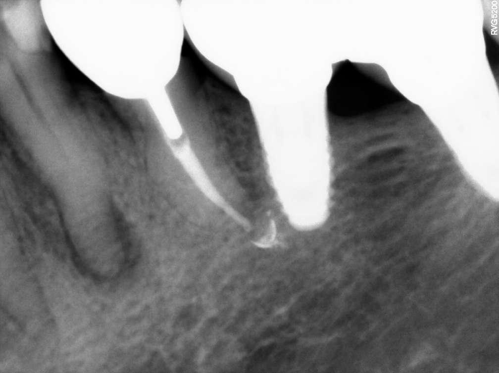 Untere Prämolaren können manchmal zwei oder drei Kanäle aufweisen. Eine solche ungewöhnliche Anatomie ist oft mit engen, stark gekrümmten, konfluenten oder divergierenden Kanälen verbunden. Der letzte Fall ist sehr komplex und erfordert in der Regel den Einsatz von Instrumenten, welche in zwei verschiedenen Kanälen ( daher flexibel und präbendal ) mit unterschiedlichen Winkelstellungen ausgerichtet werden können. Ein angemessener Gleitpfad hilft auch bei der NiTi-Formung, er löst aber nicht immer das Problem. Daher wurde im vorliegenden Fall die primäre EinzelfeileReziproziertechnik EOF verwendet. Die Instrumente wurden in ihrem apikalen Teil vorgeformt, in die beiden verschiedenen Kanäle eingeführt und dann aktiviert. Die Wahl der Instrumente war effektiv, weil die mechanischen Eigenschaften des EOF-Primärs (flexibel und vorgebogen) es ermöglichen, präzise und einfach in jeden Kanal eingeführt zu werden und diese dann zu behandeln. Die Verwendung einer einzigen Feiltechnik ermöglichte es, sich der Herausforderung eines divergierenden Kanals nur einmal zu stellen, was Zeit spart und die Komplexität reduziert. Die Verwendung traditioneller Instrumente kann in vielen Fällen helfen, den Weg mit kleineren und flexibleren Instrumenten zu finden, aber nicht mit größeren. Durch die Verwendung von nur einer Feile erwies sich das gesamte Verfahren als einfacher und schneller, sodass beide Kanäle korrekt geformt, gereinigt und abgedichtet werden konnten.