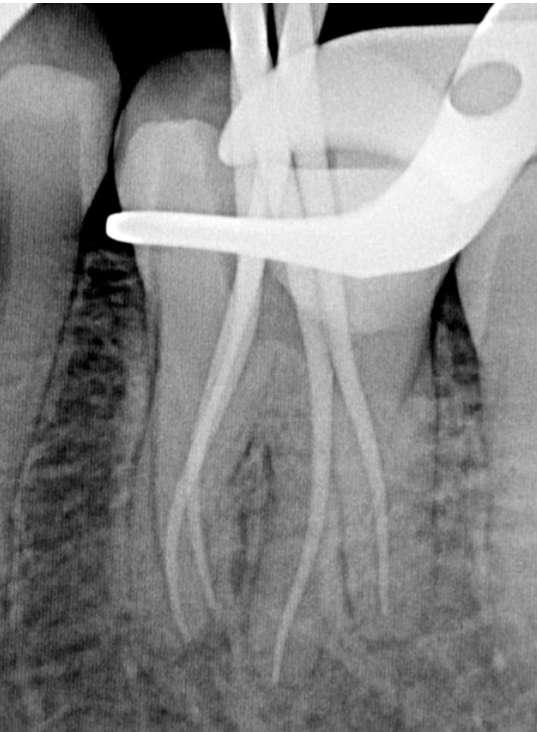 Die endodontische Behandlung fand in einer Sitzung statt. Nach Anästhesie und Anlegen des Kofferdams erfolgte die Entfernung der provisorischen Füllung und die initiale intrakoronale Diagnostik. Mittels Microopener konnte ein mesiobukkaler, mesiolingualer, distobukkaler und distolingualer Wurzelkanal sondiert werden. Die Ausarbeitung der primären Zugangskavität zur besseren Zugänglichkeit der Kanäle erfolgte mit Langschaftrosenbohrern. Anhand des präoperativen diagnostischen Röntgenbilds konnte die Länge der Wurzelkanäle vorläufig näherungsweise bestimmt werden. Die Kanäle wurden im weiteren Therapieverlauf kontinuierlich mit 6% NaOCl gespült. Nach Ausarbeitung der Zugangskavität folgte die koronale Erweiterung der Wurzelkanäle mit EdgeEndo X7 Feilen der Größe 17.06. Die elektrometrische Bestimmung der Kanallänge mithilfe eines Morita Root ZX Mini Apex Locators wurde mit C-Piloten der Größe 8-10 durchgeführt. Nach Festlegung der Arbeitslänge wurde der