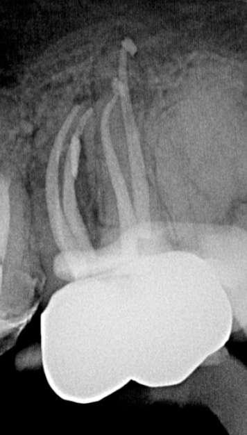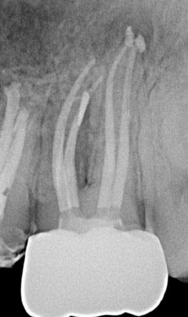 Nach Abschluss der Präparation wurden die Kanäle getrocknet, Kalziumhydroxid auf volle Arbeitslänge eingebracht und der Zahn provisorisch mit einer adhäsiven Kompositfüllung verschlossen. Die Weiterbehandlung fand nach zwei Wochen bei Beschwerdefreiheit statt. Nach erneuter elektrometrischer Kontrolle der Arbeitslänge, Anfertigung einer Masterpointaufnahme (Abbildung 12) und schallaktivierter Abschlussspülung mit 17% EDTA und 6% NaOCl wurden die Kanäle in warm vertikaler Fülltechnik mit biokeramischem Sealer gefüllt (Abbildung 15). Der direkte adhäsive Verschluss der Zugang erfolgte mit einem Bulk Fill Flow Komposit (Abbildung 14).